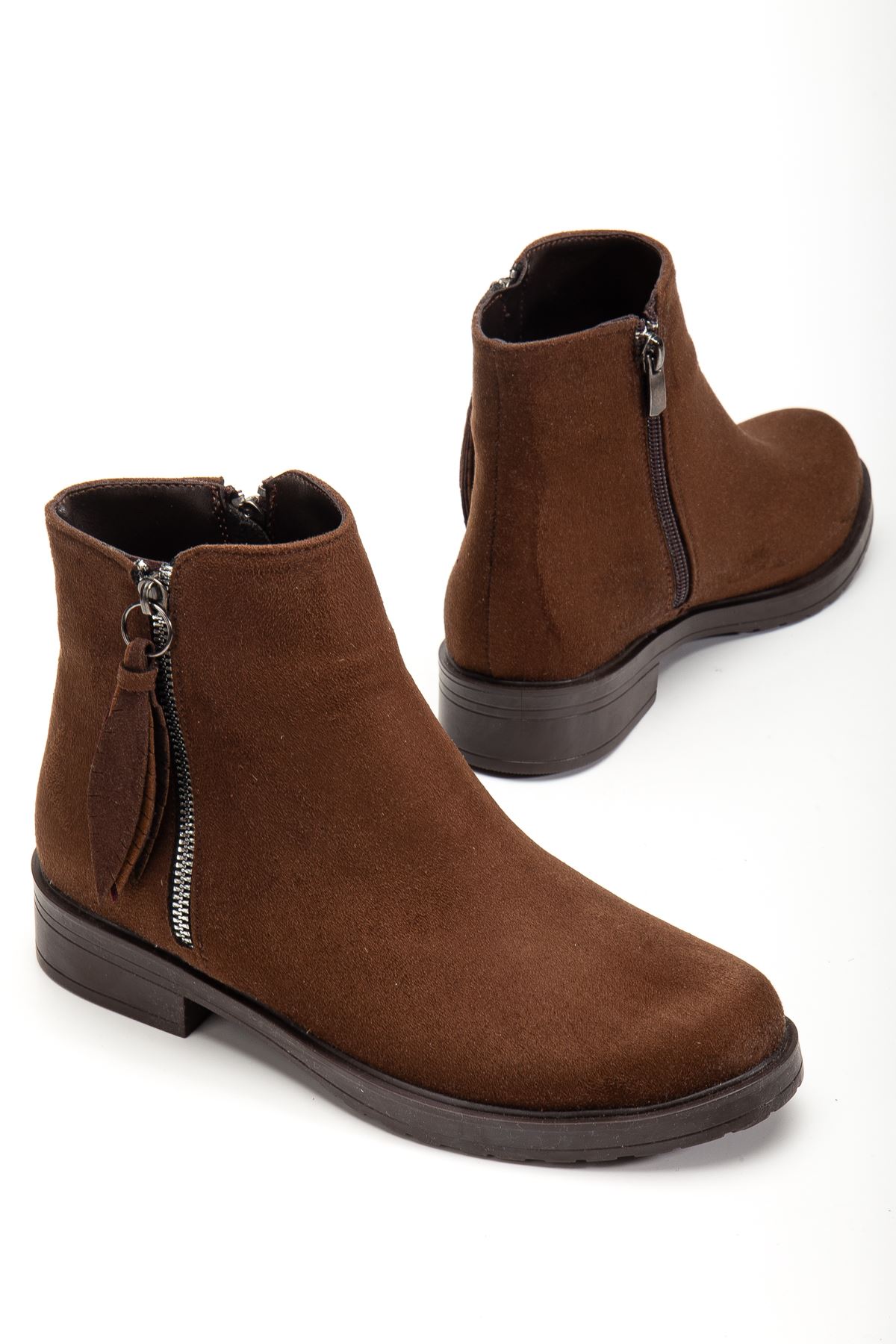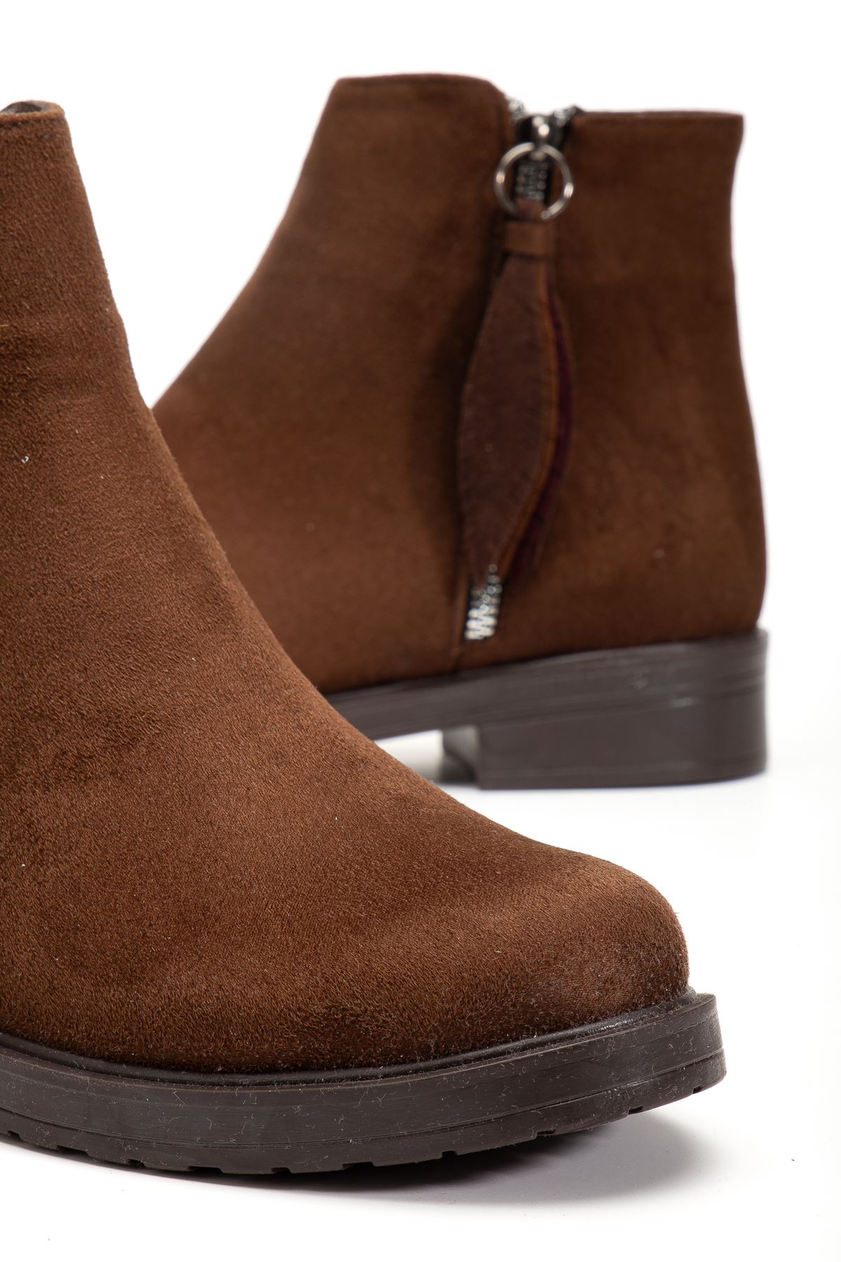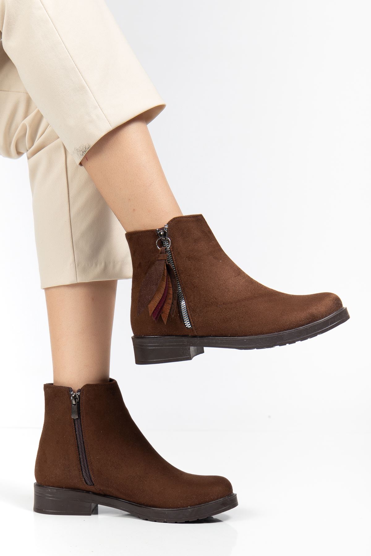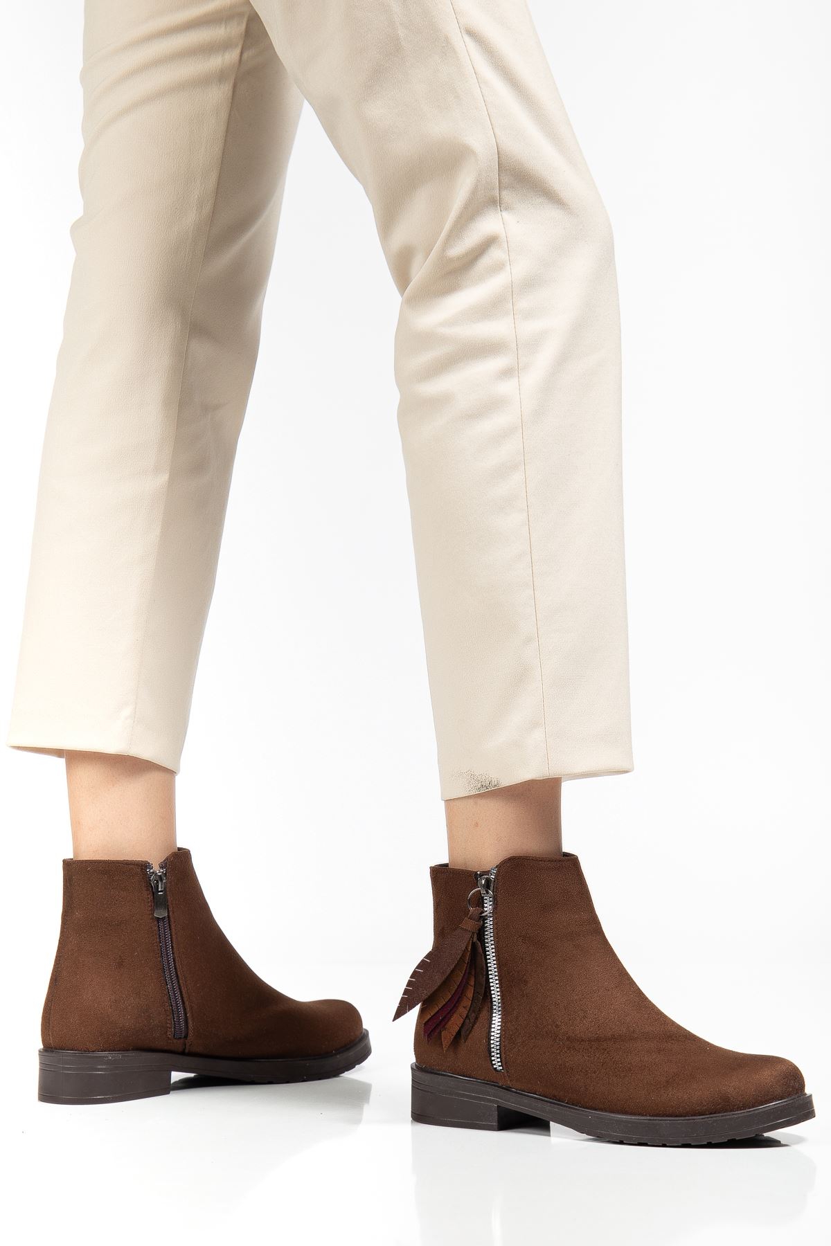 165-205 Kahve Süet Yaprak Desenli Fermuarlı Günlük Kadın Bot