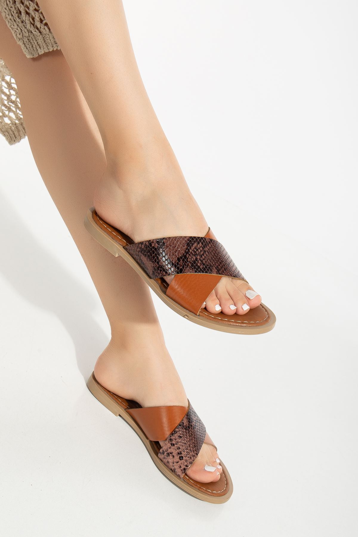 169-076 Taba Ortopedik Hakiki Deri Çapraz Bantlı Kadın Terlik