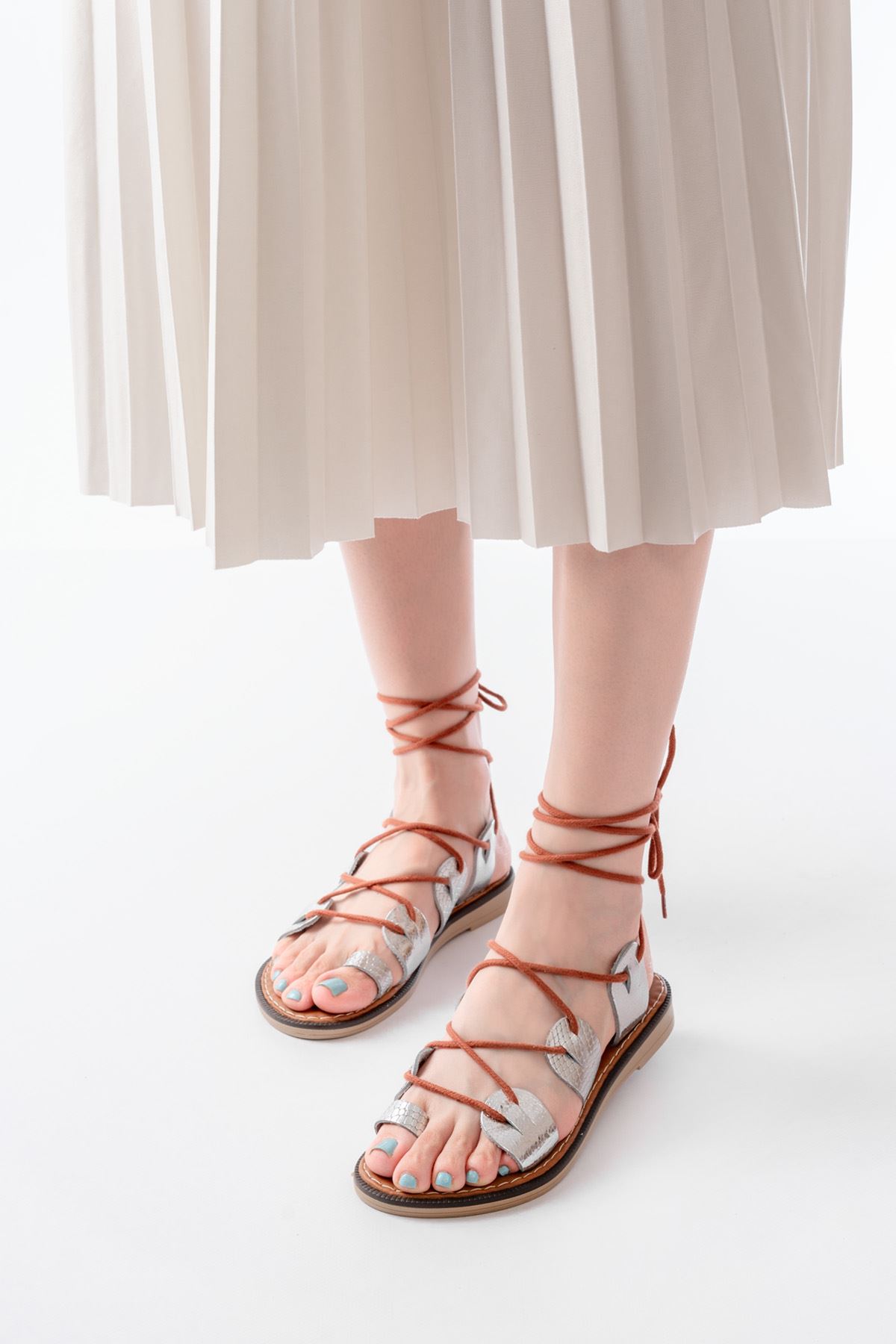 205-01 Gümüş Bilekten Bağlamalı Ortopedik Hakiki Deri Kadın Sandalet