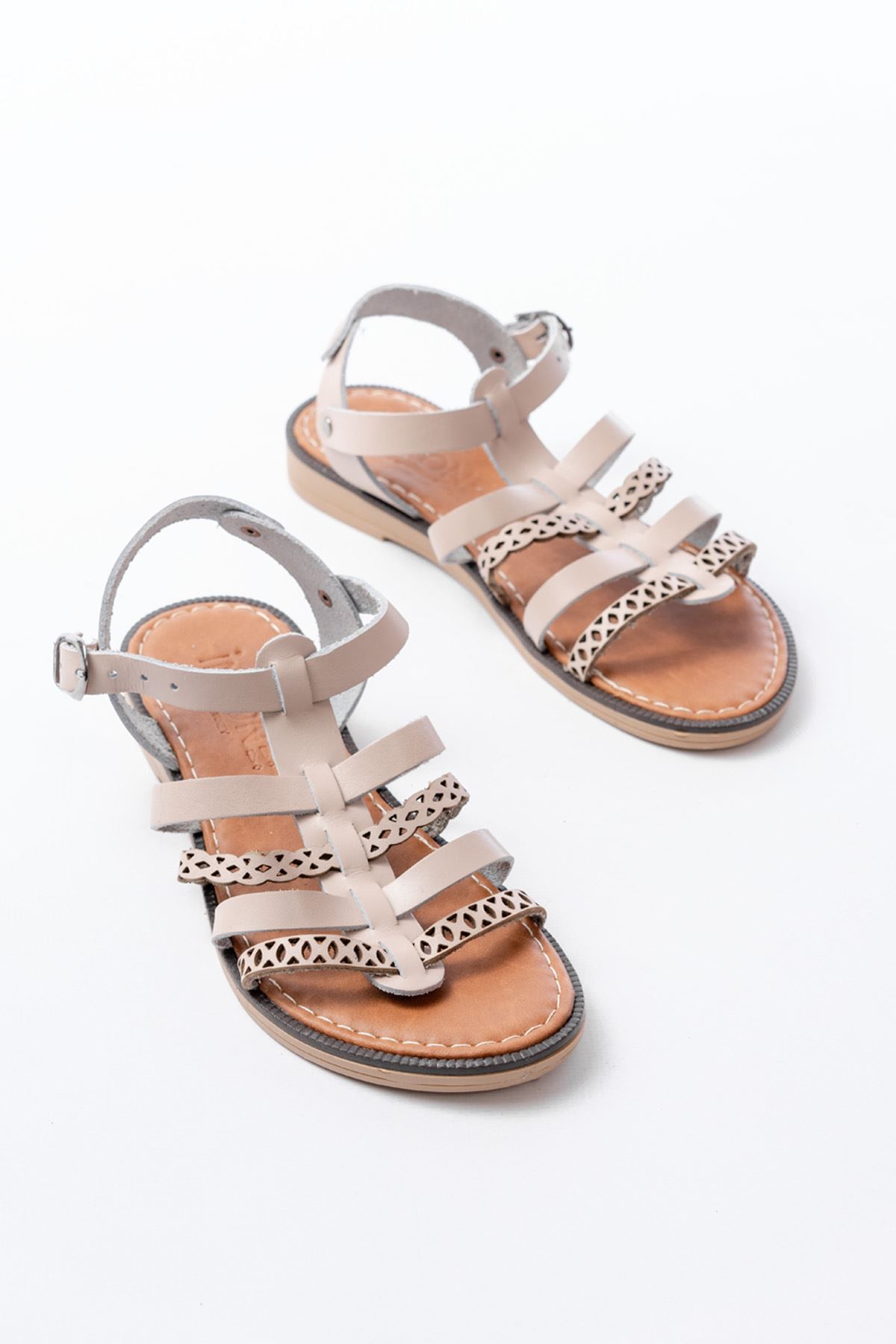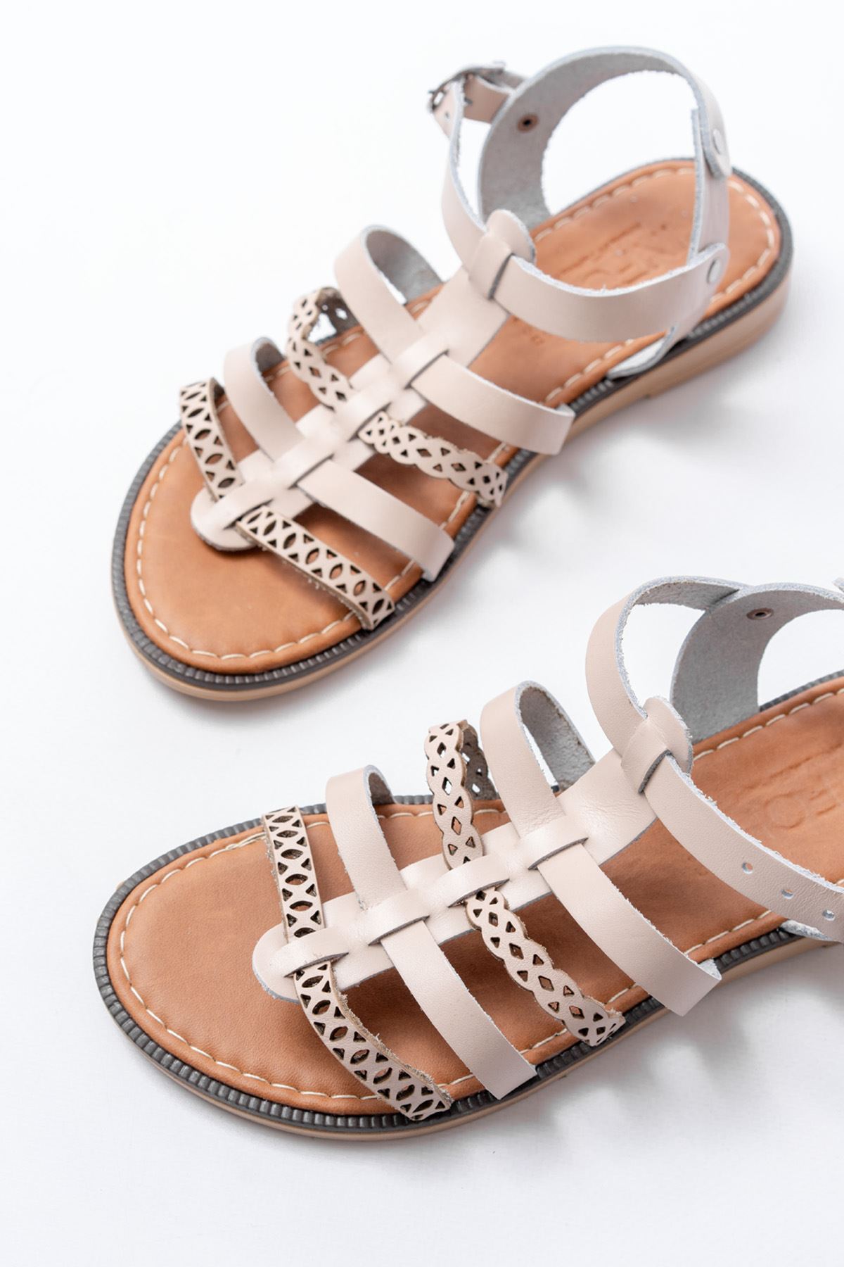 205-014 Bej Lazerli Kesim Hakiki Deri Ortopedik Taban Günlük Kadın Sandalet