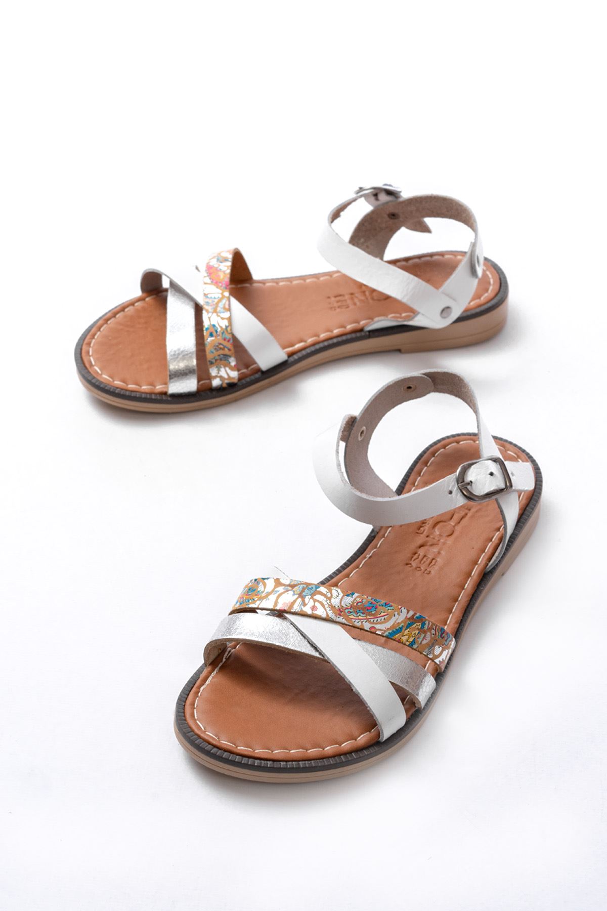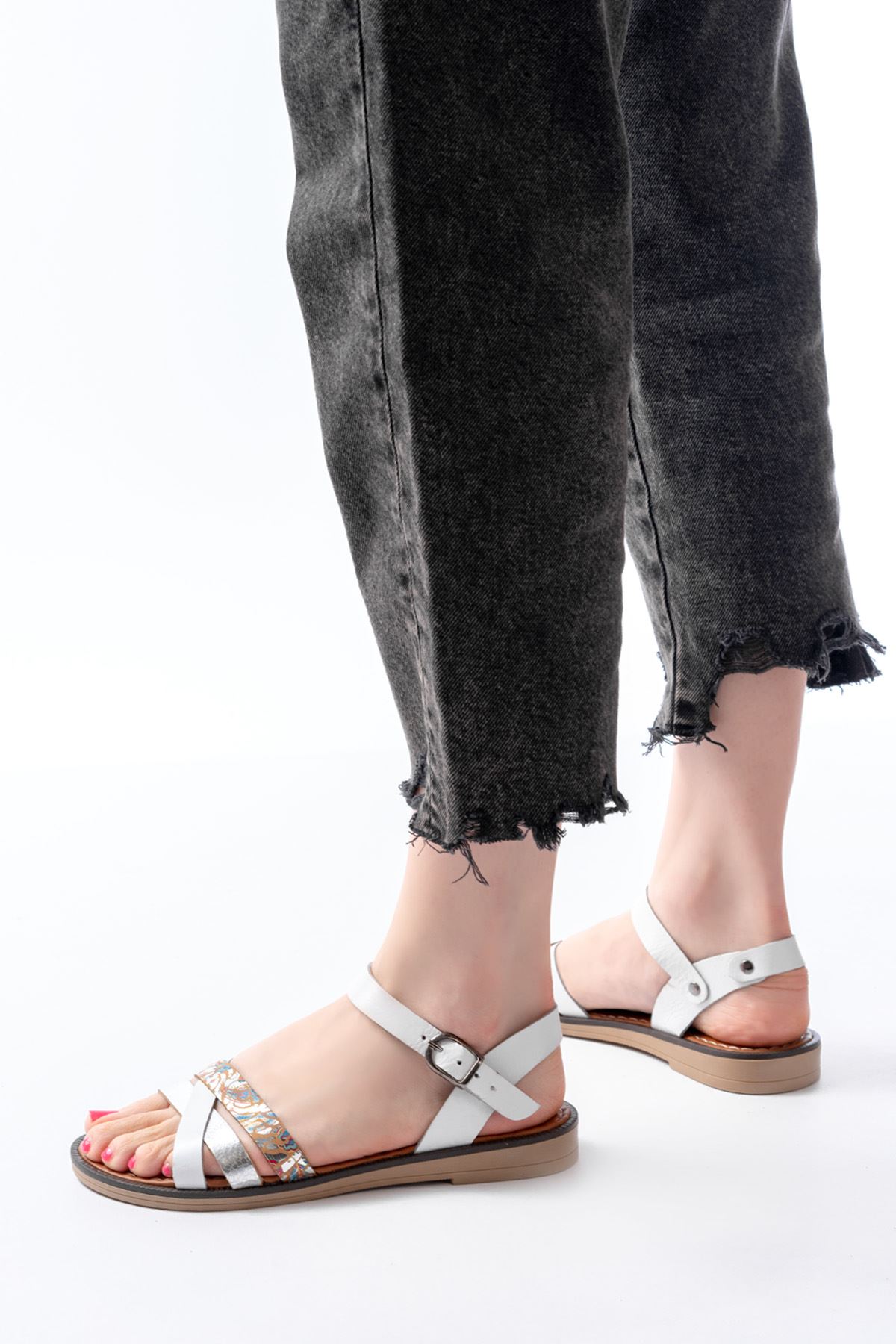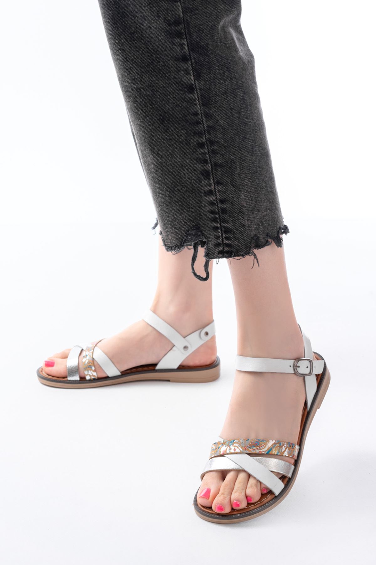 205-015 Beyaz Garni Ortopedik Hakiki Deri Kadın Sandalet