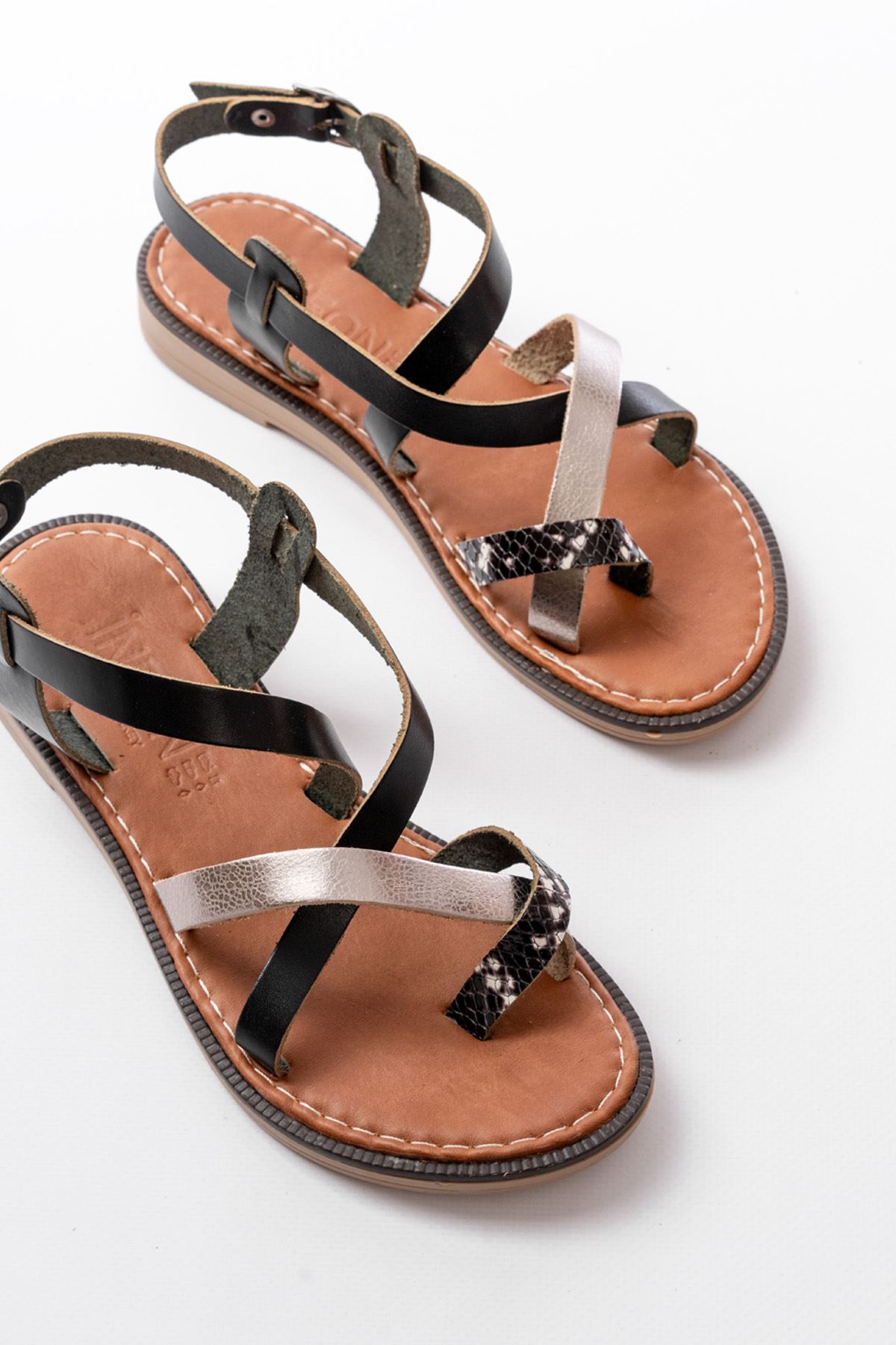 205-08 Siyah Garni Ortopedik Hakiki Deri Kadın Sandalet