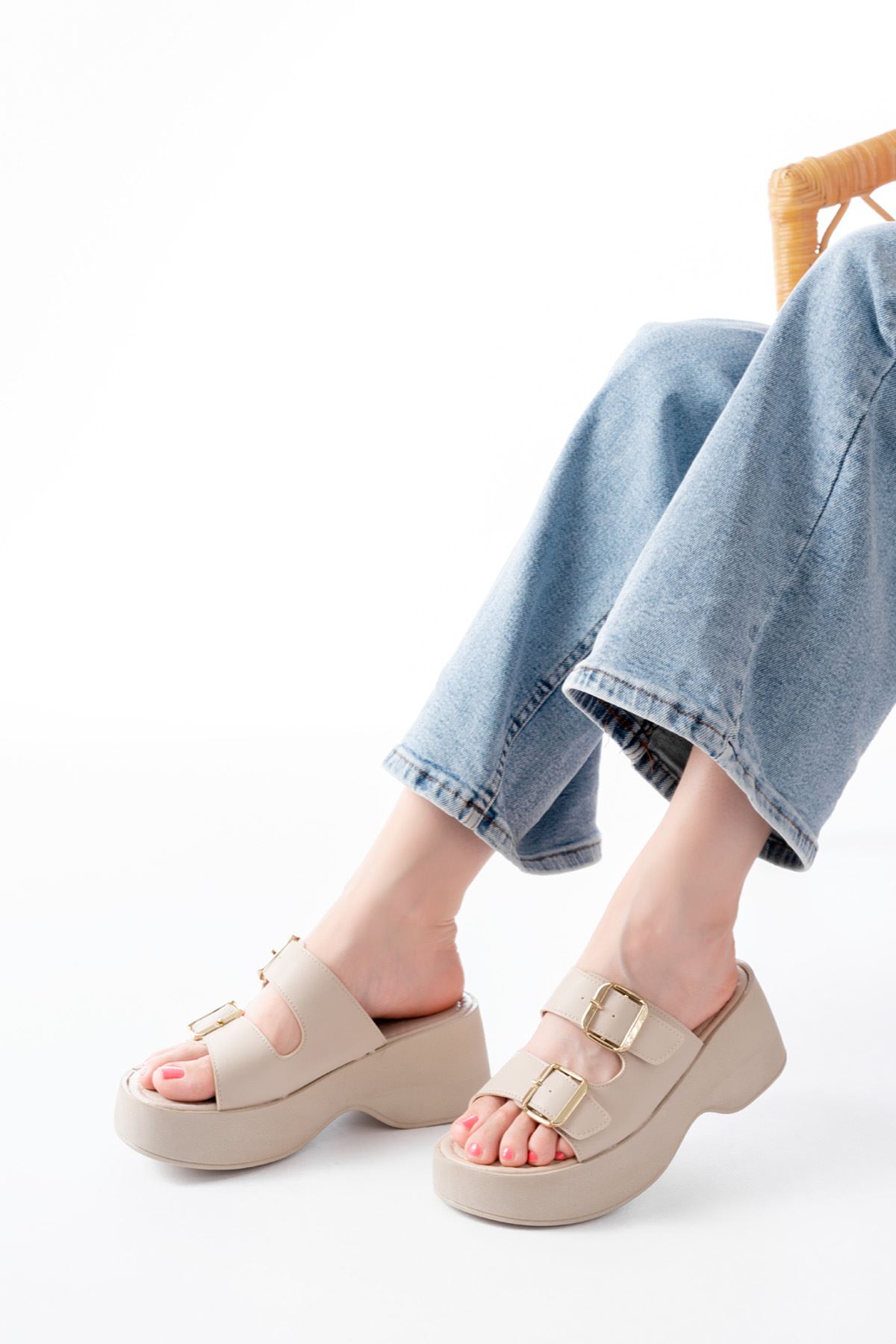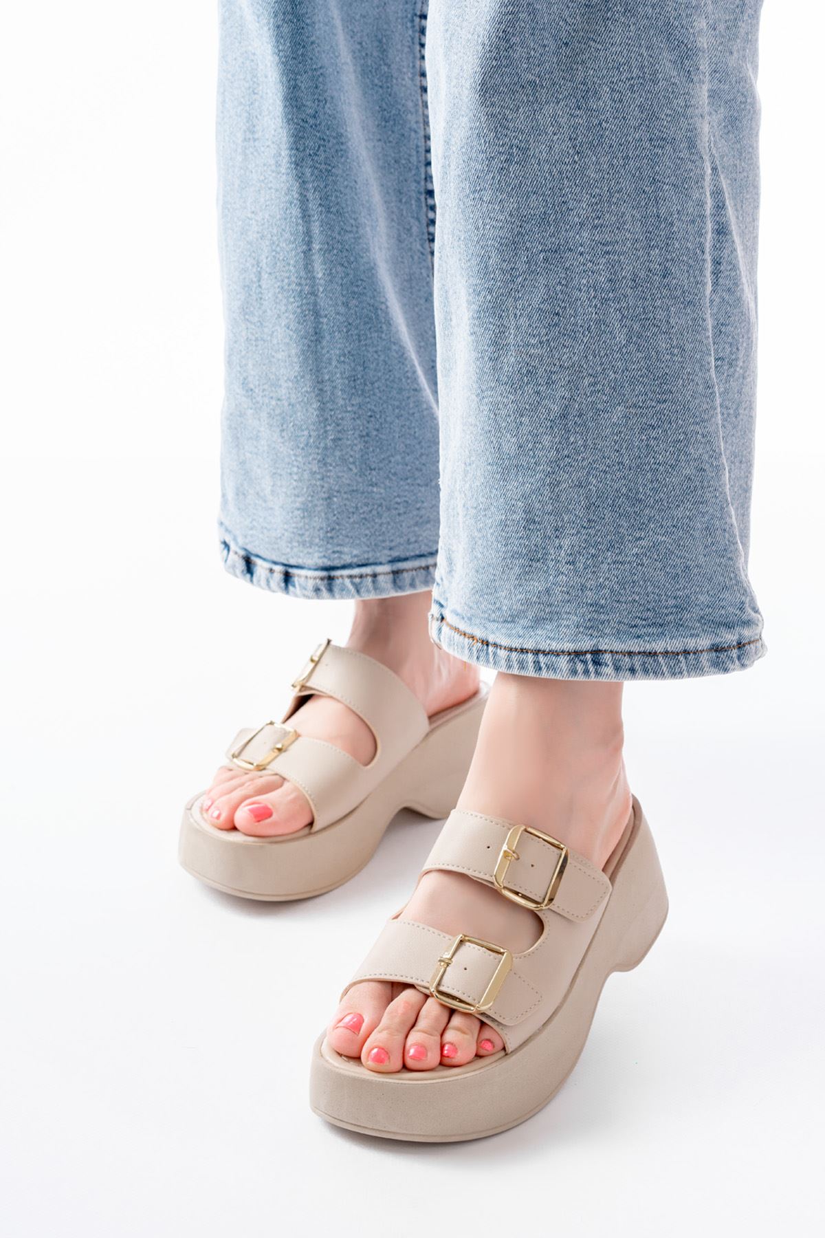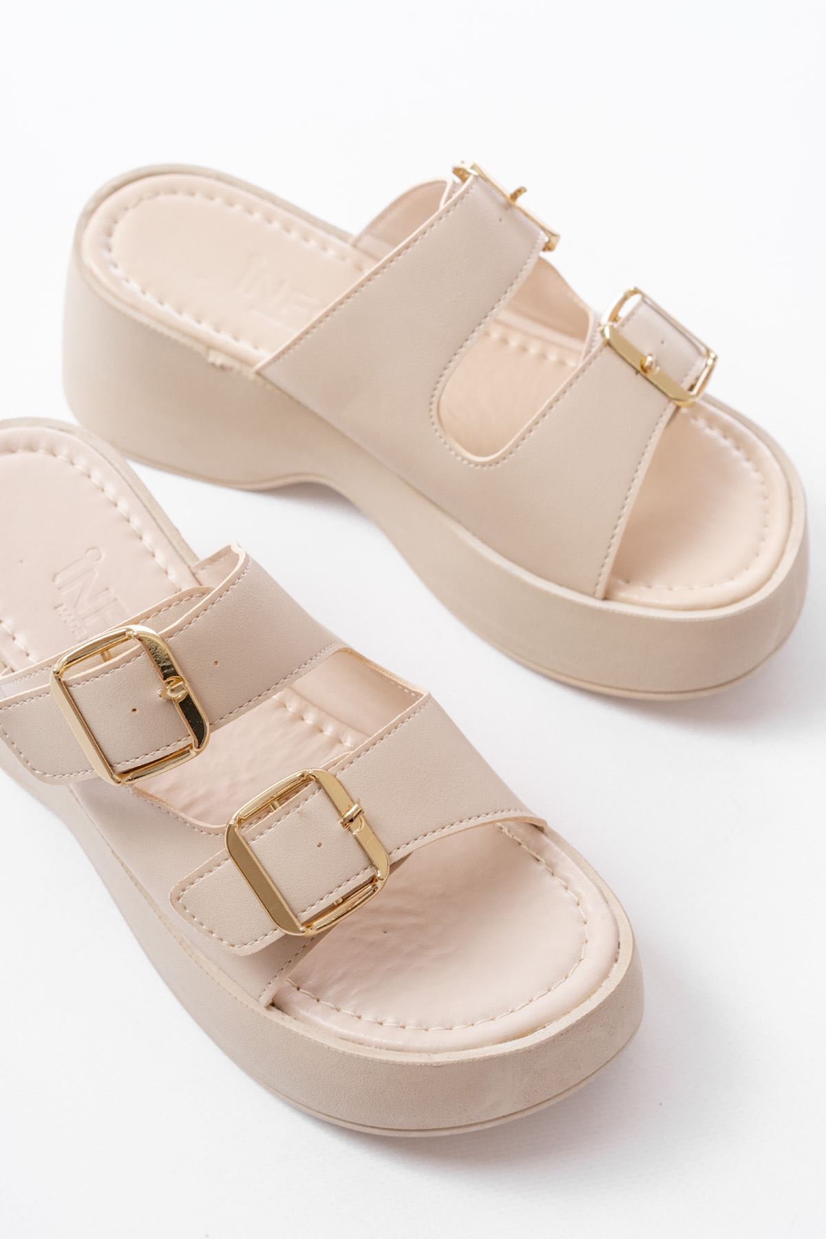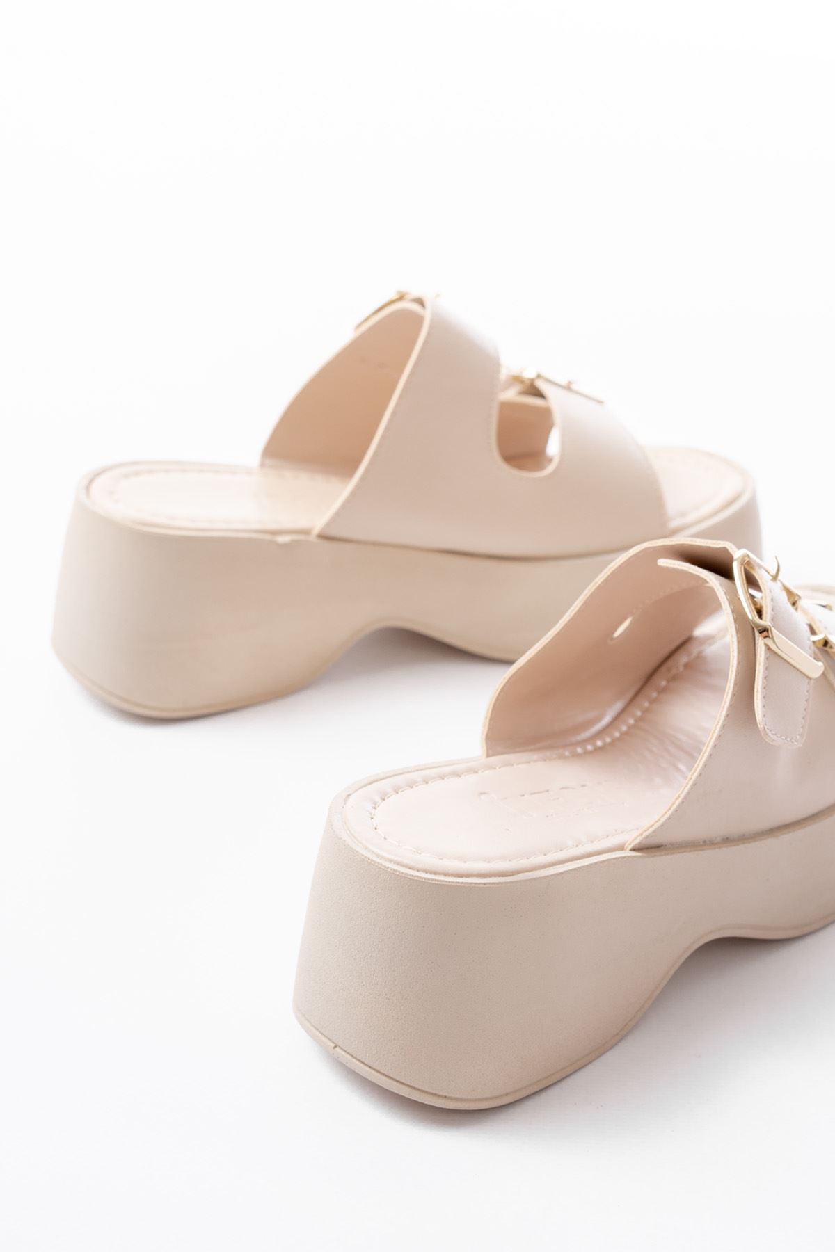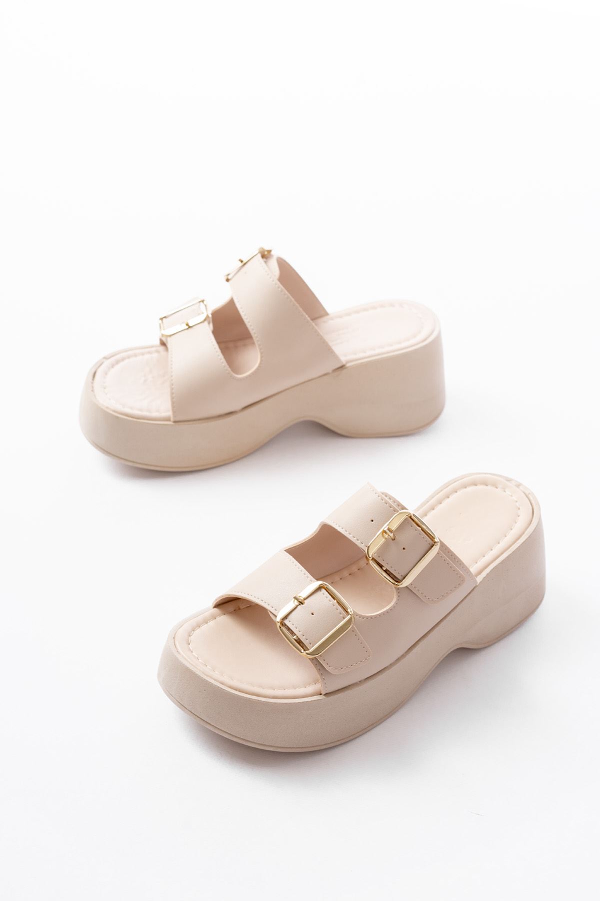 24414-574 Bej Günlük Tokalı Dolgu Topuk Kadın Terlik