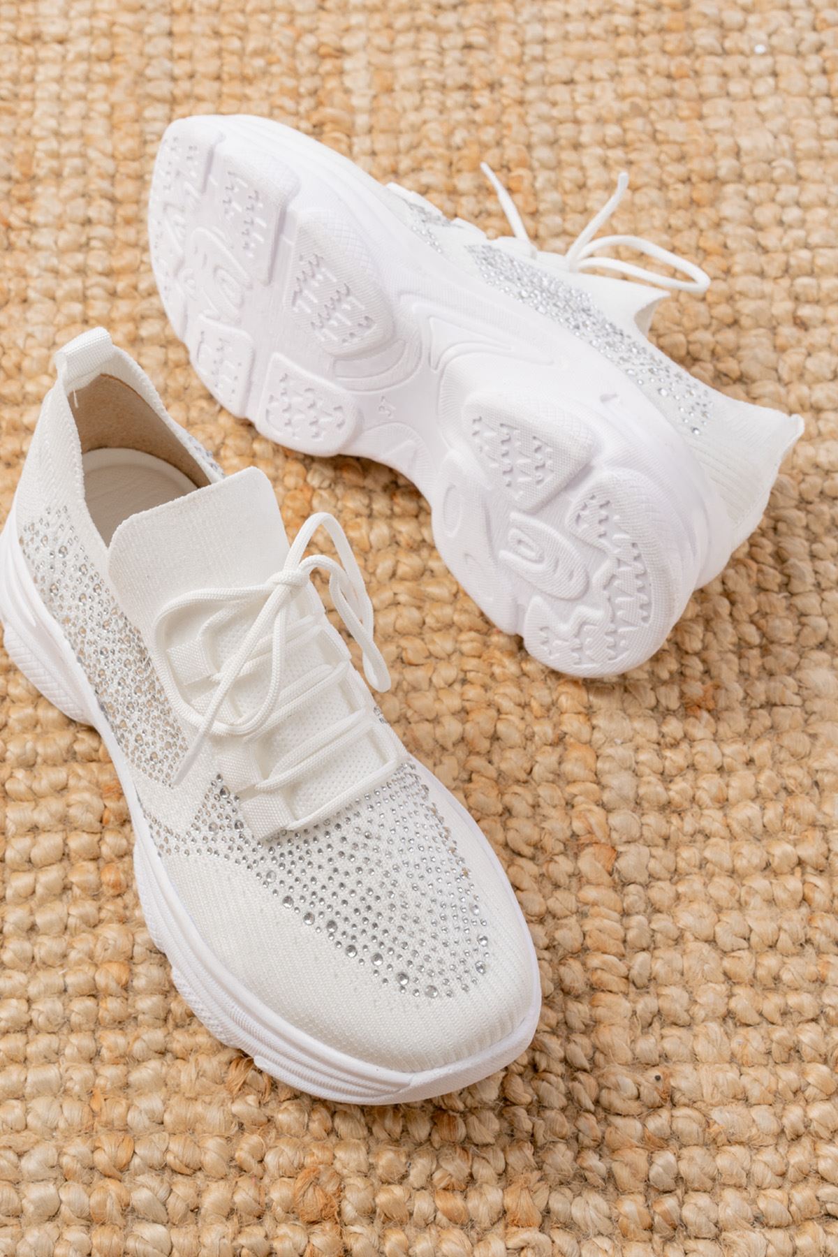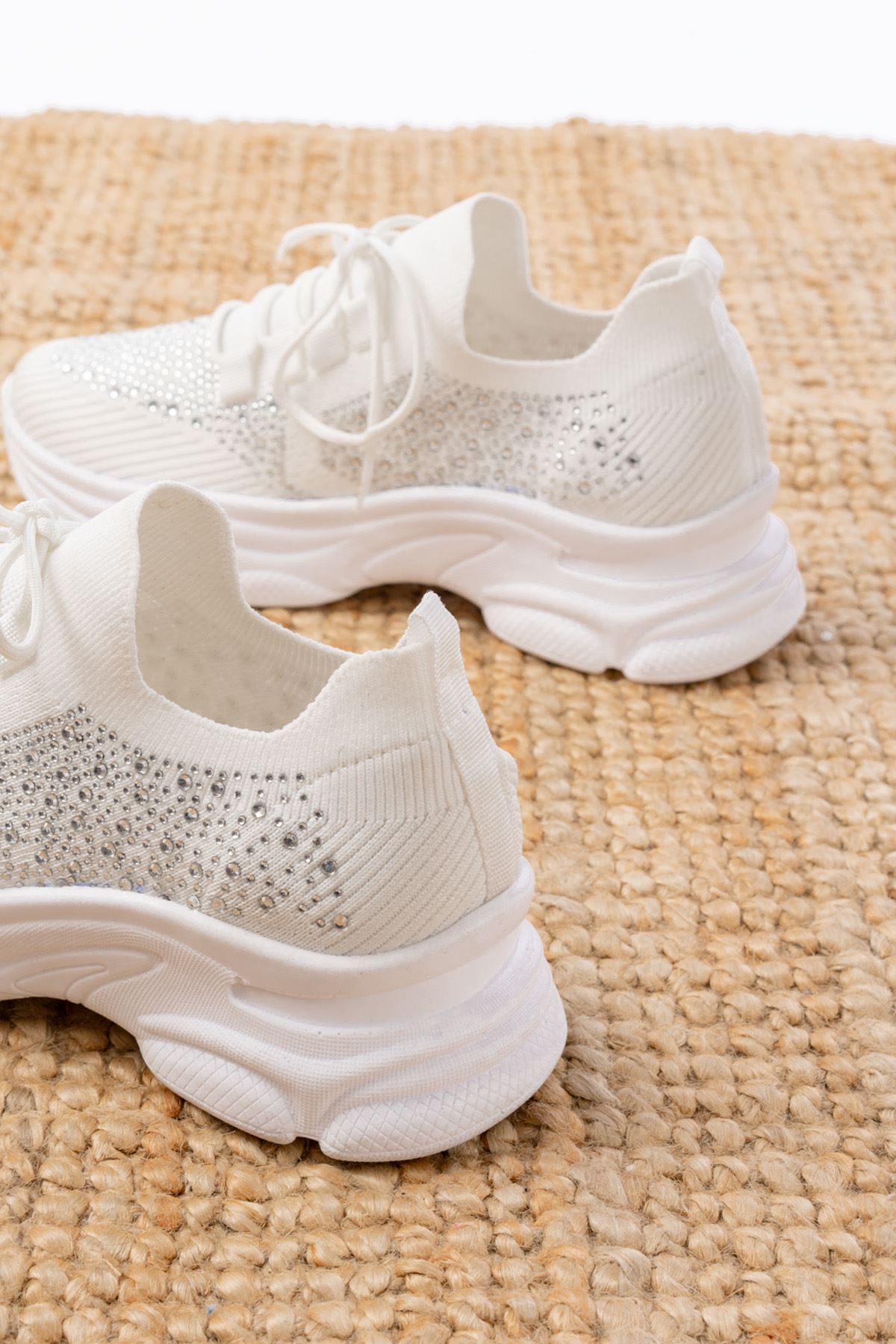 3002 Beyaz Bağcıklı Fileli Taş Aksesuarlı Günlük Spor Ayakkabı