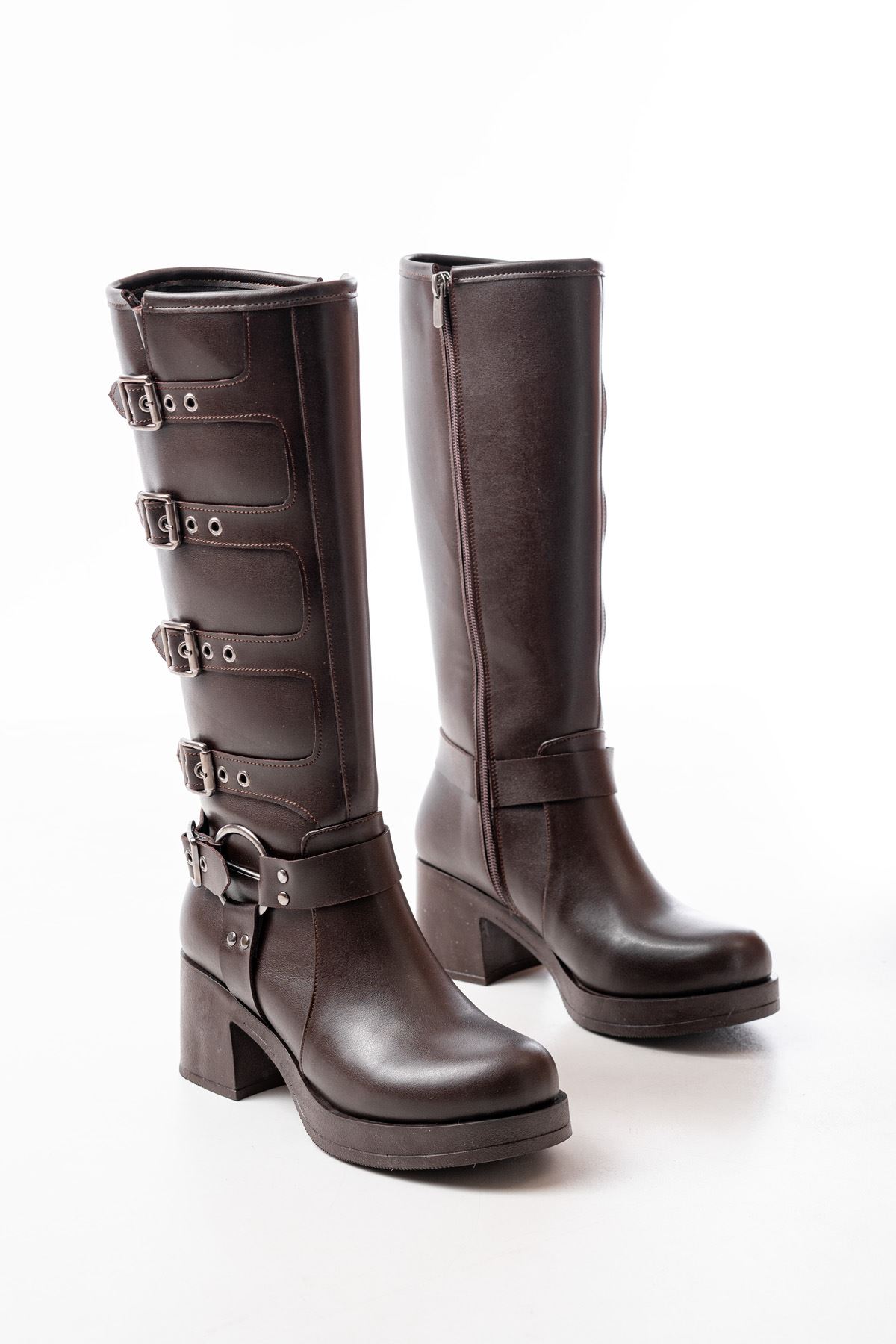 5109-3015 Kahverengi Topuklu Fermuarlı Toka Aksesuarlı Günlük Kadın Çizme
