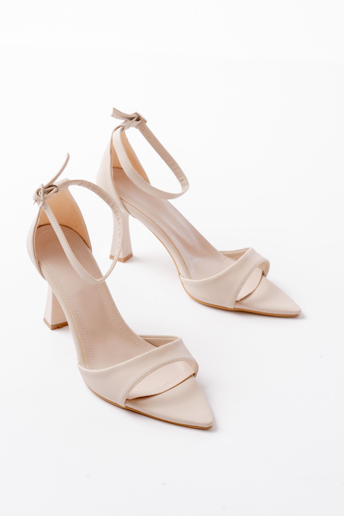 718 Bej Cilt Sivri Burunlu Topuklu Bilekten Bağlamalı Kadın Ayakkabı