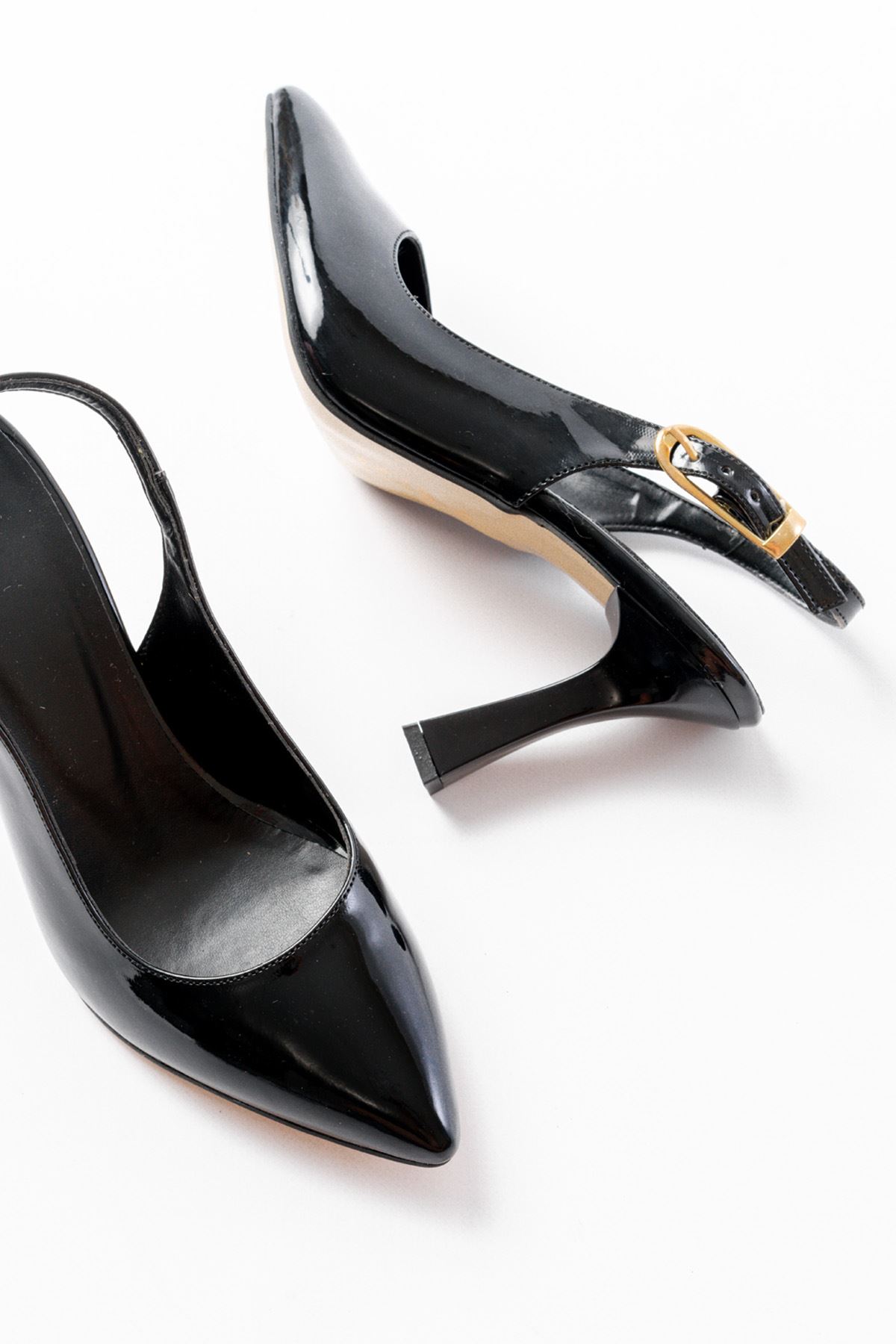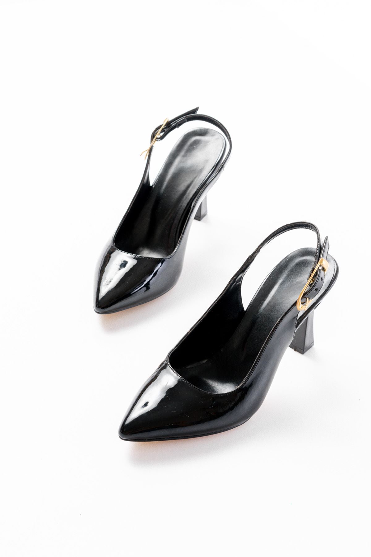 719 Siyah Rugan Sivri Burunlu Toka Detaylı Topuklu Kadın Ayakkabı