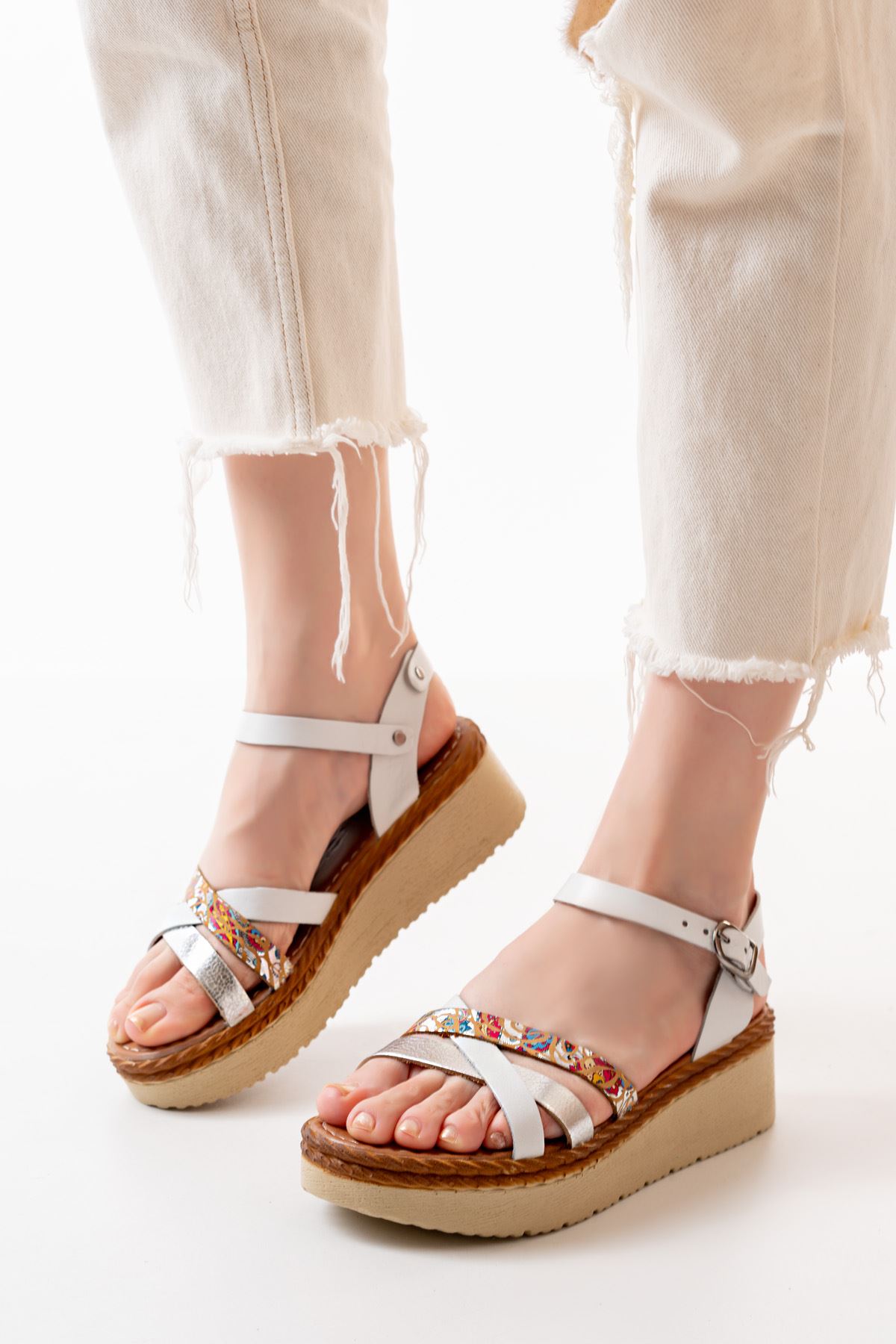730-015 Beyaz Garni Ortopedik Hakiki Deri Dolgu Kadın Sandalet