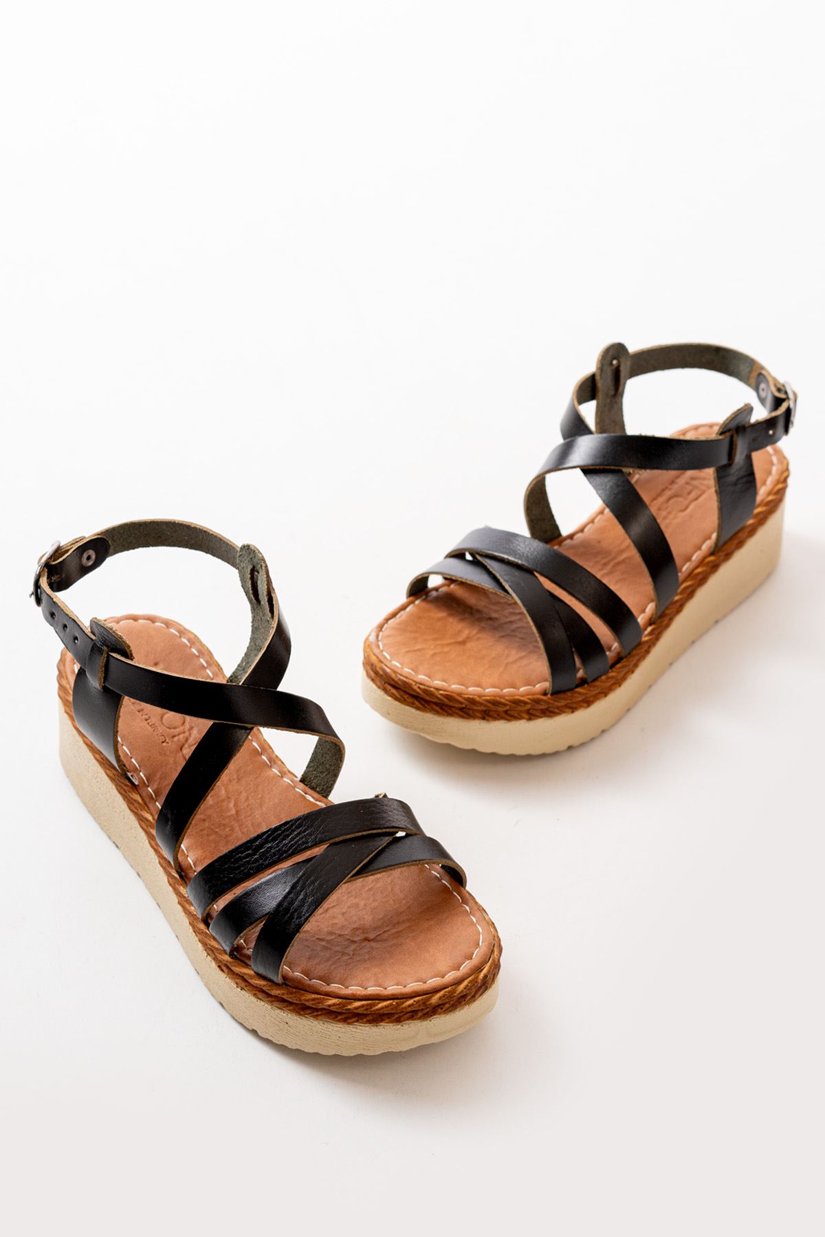 730-153 Siyah Ortopedik Hakiki Deri Dolgu Kadın Sandalet