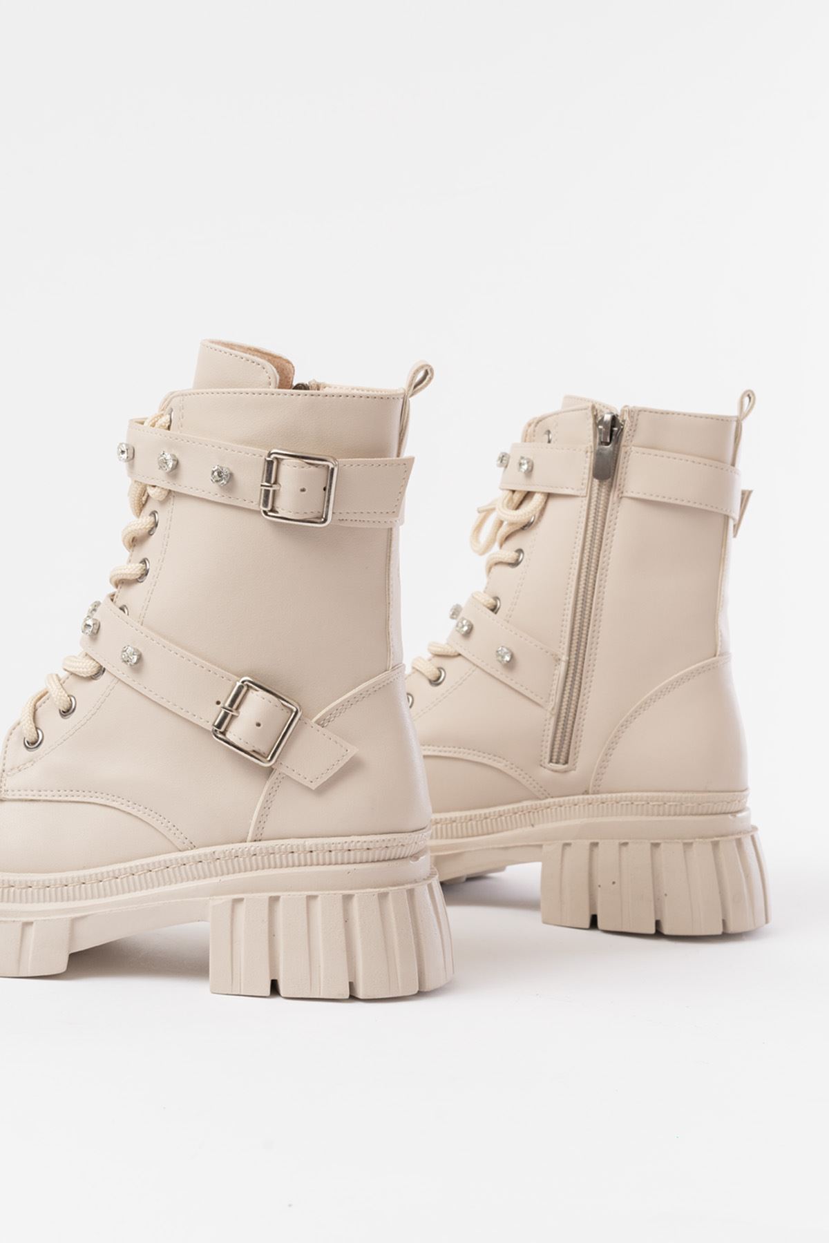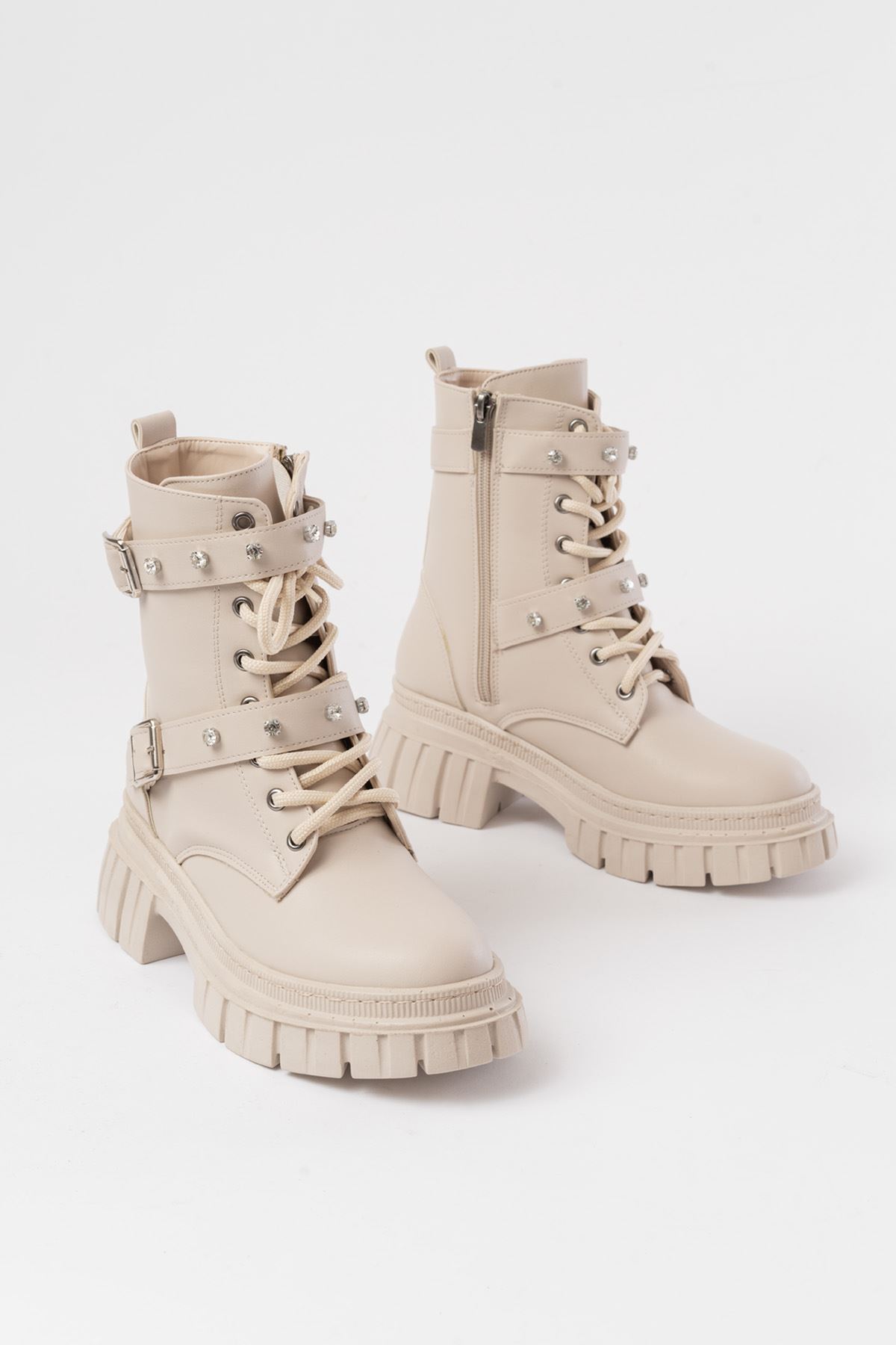 842-03 Bej Bağcıklı Kalın Tabanlı Bağcıklı Fermuarlı Günlük Kadın Bot