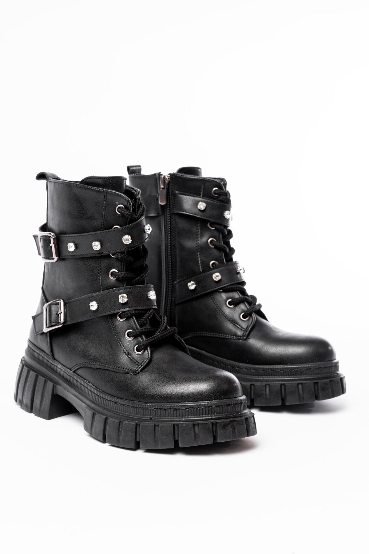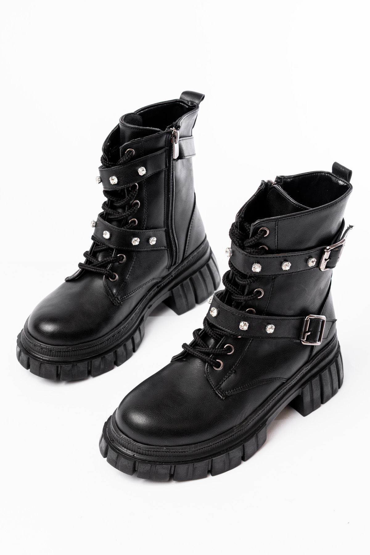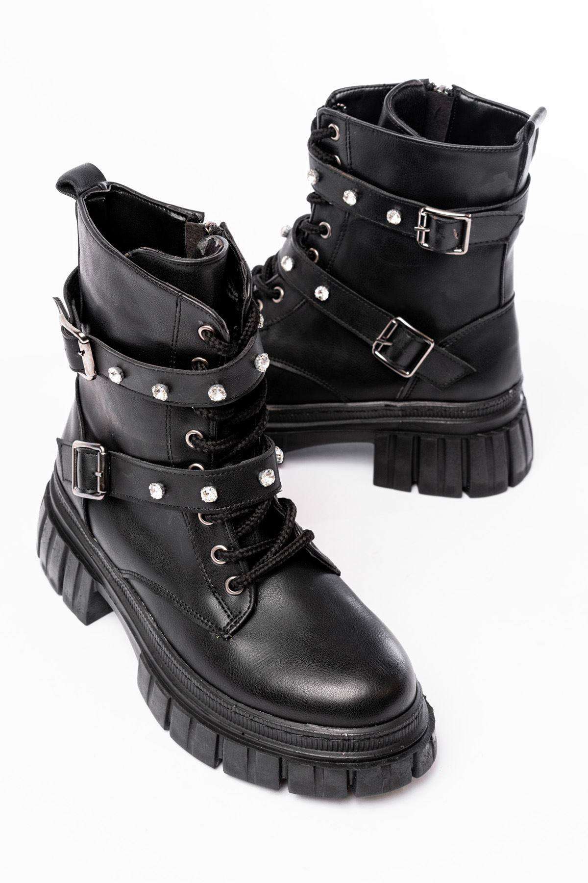 842-03 Siyah Bağcıklı Kalın Tabanlı Bağcıklı Fermuarlı Günlük Kadın Bot