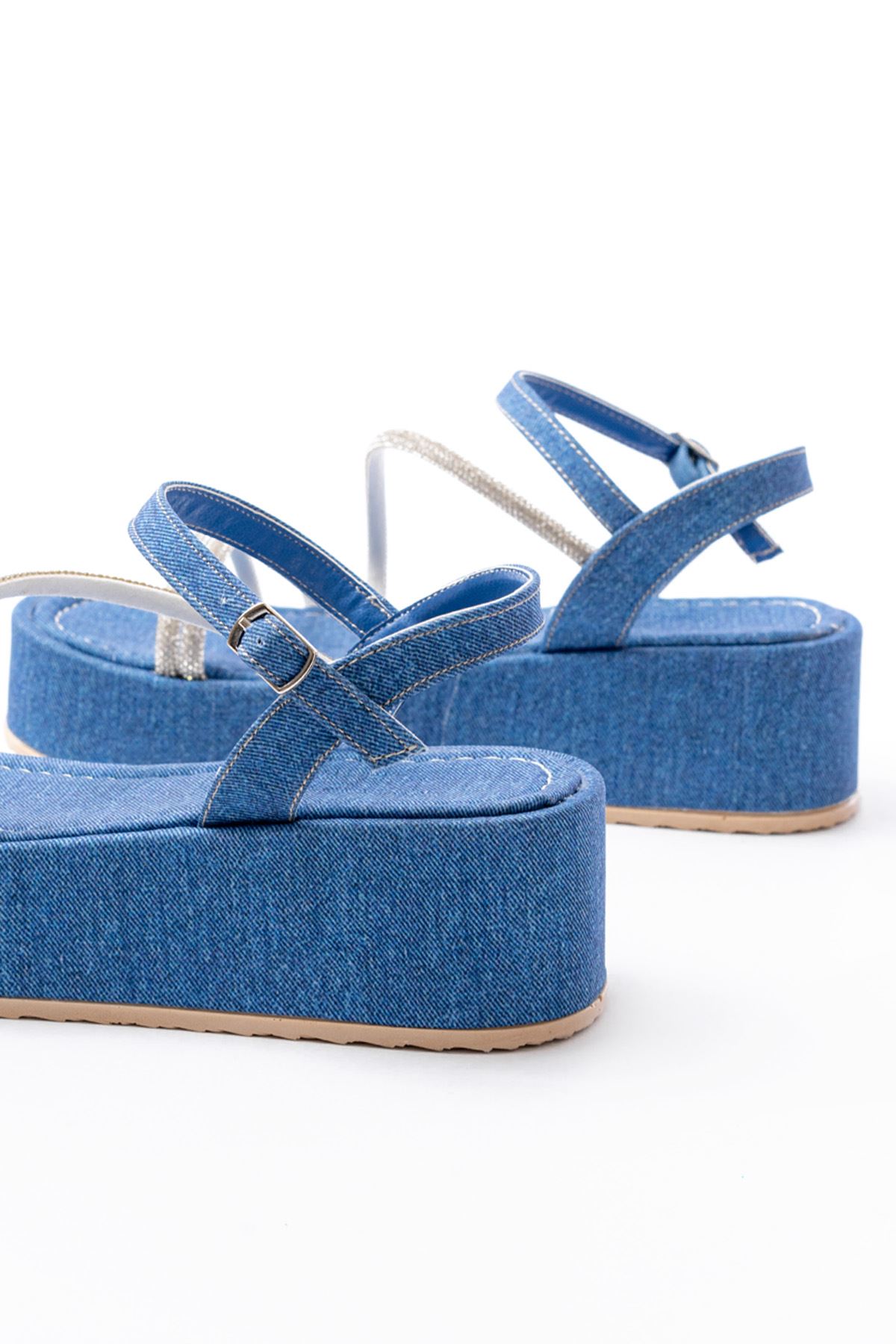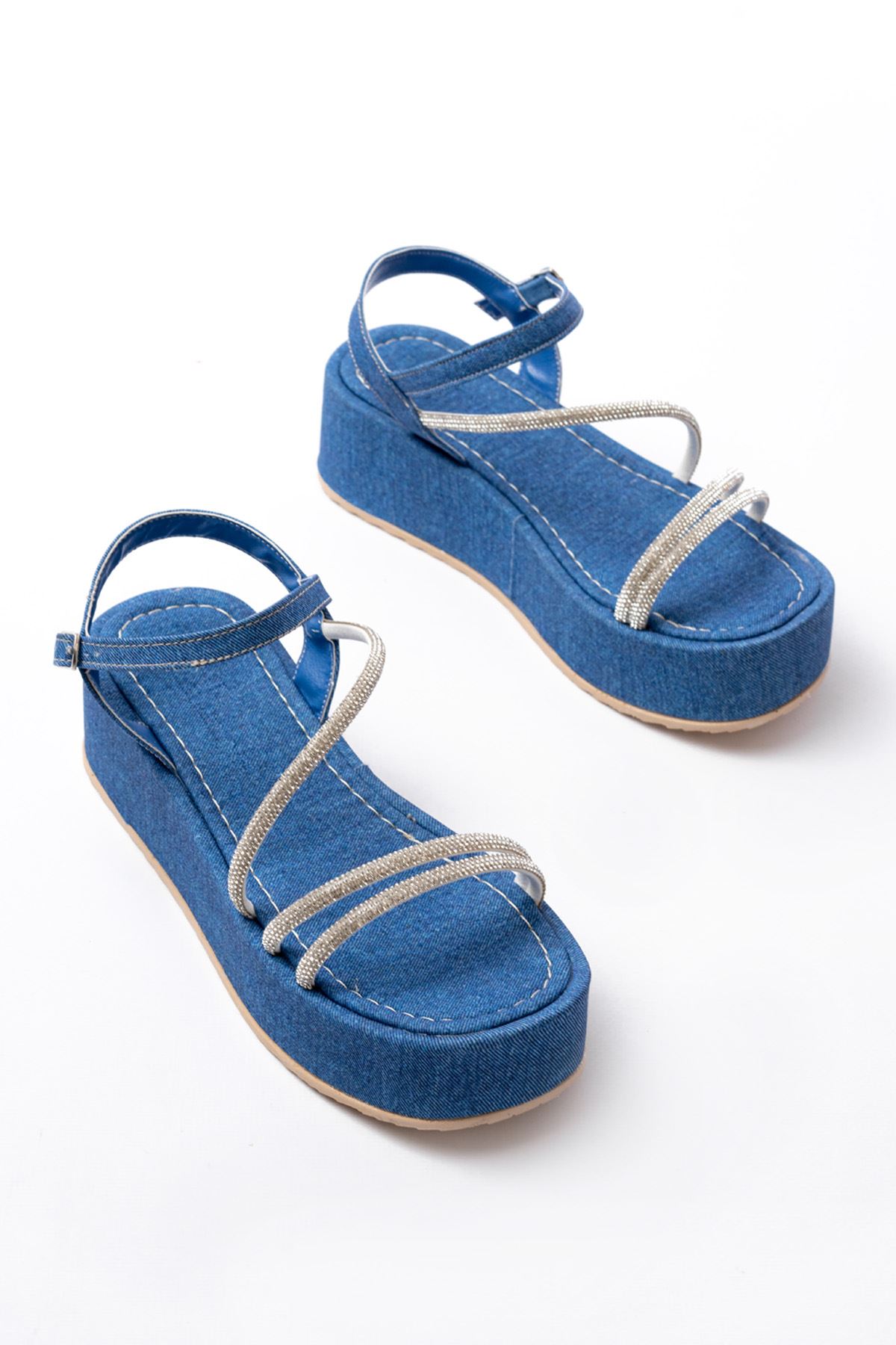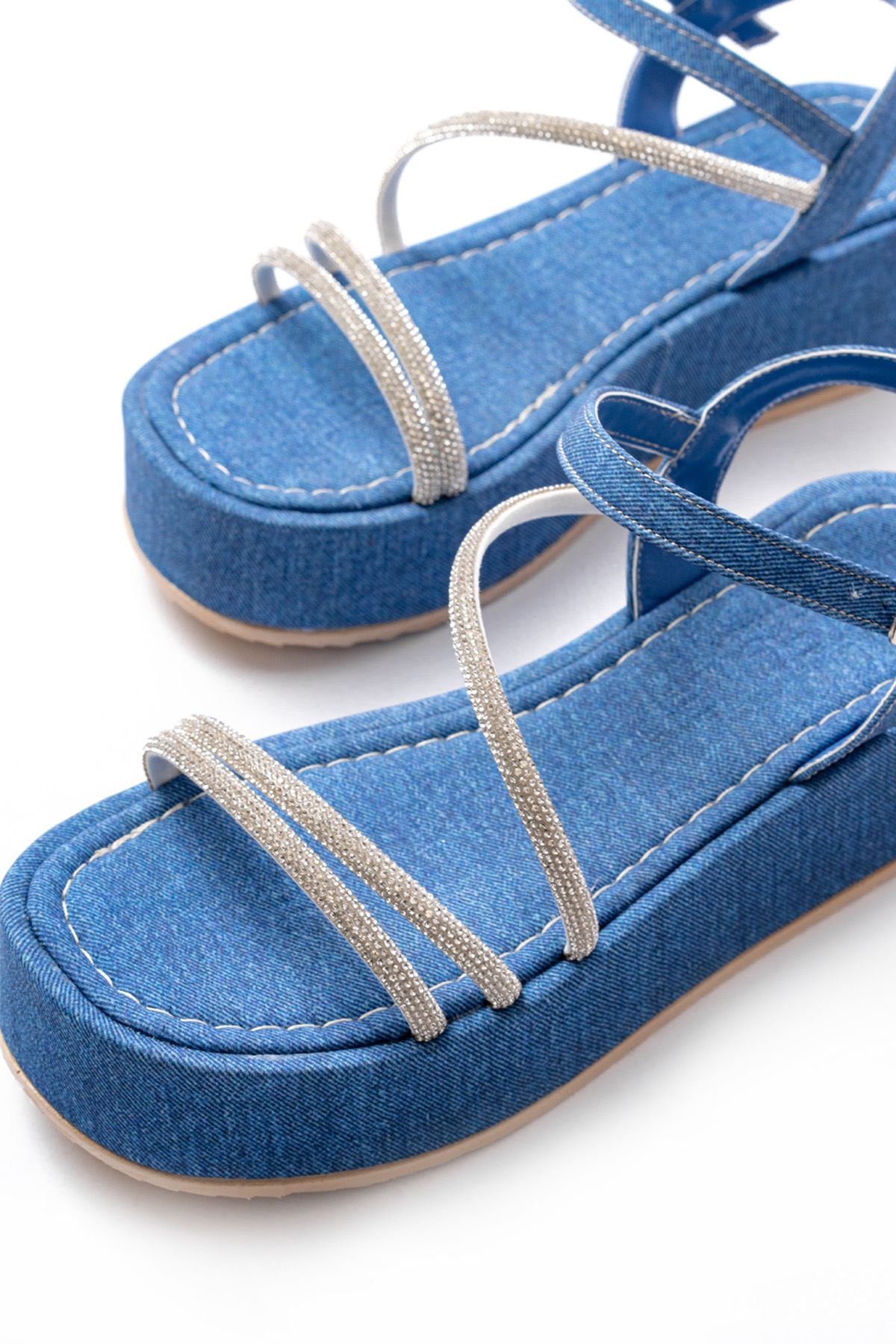 861-1017 Mavi Kot Taşlı Dolgu Topuklu Kadın Sandalet