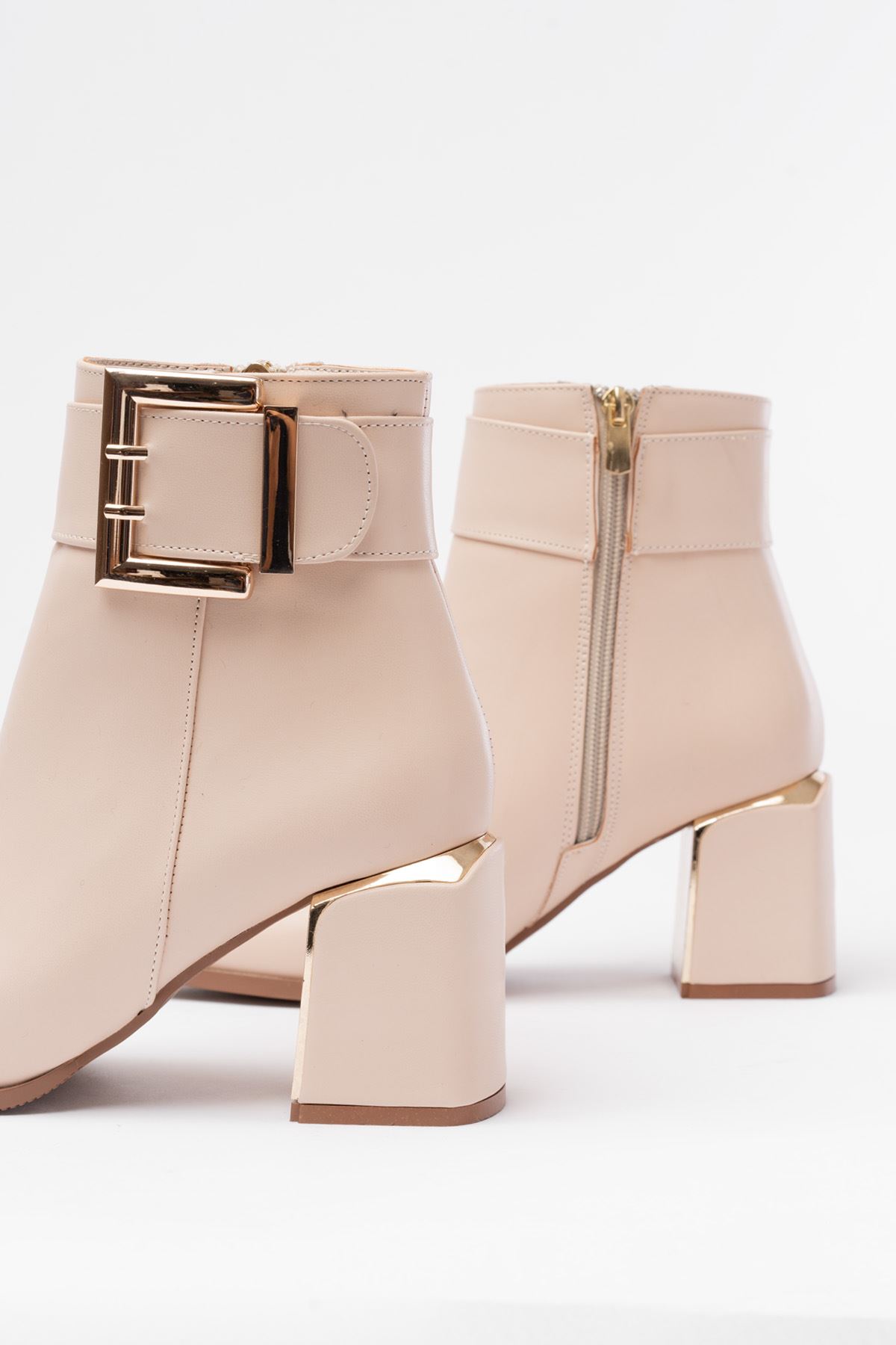 DNZ-400 Bej Toka Aksesuarlı Topuklu Fermuarlı Günlük Kadın Bot