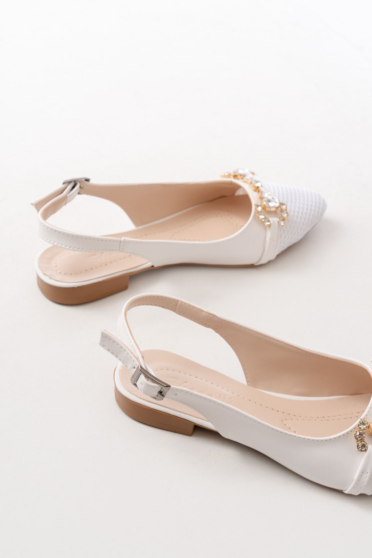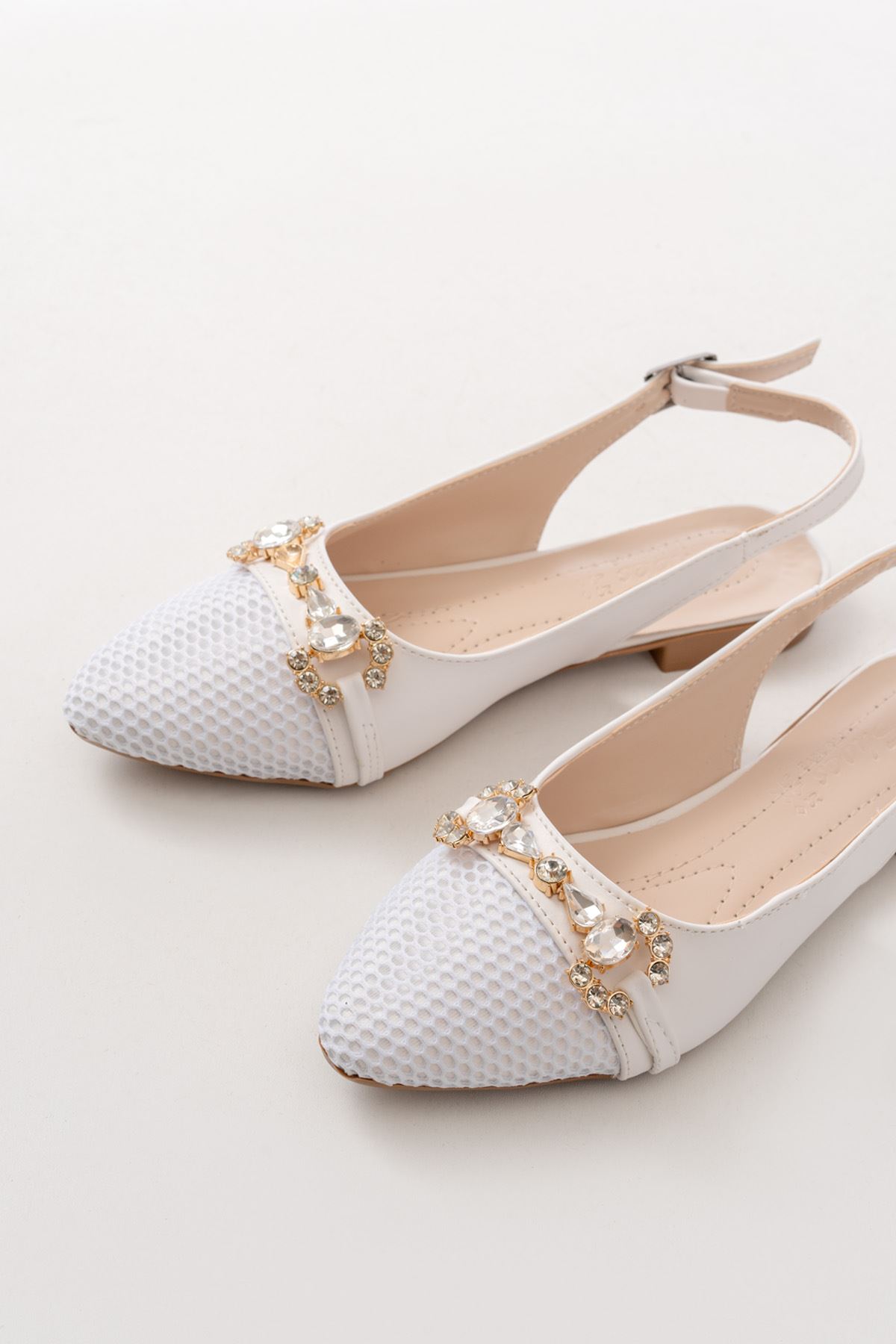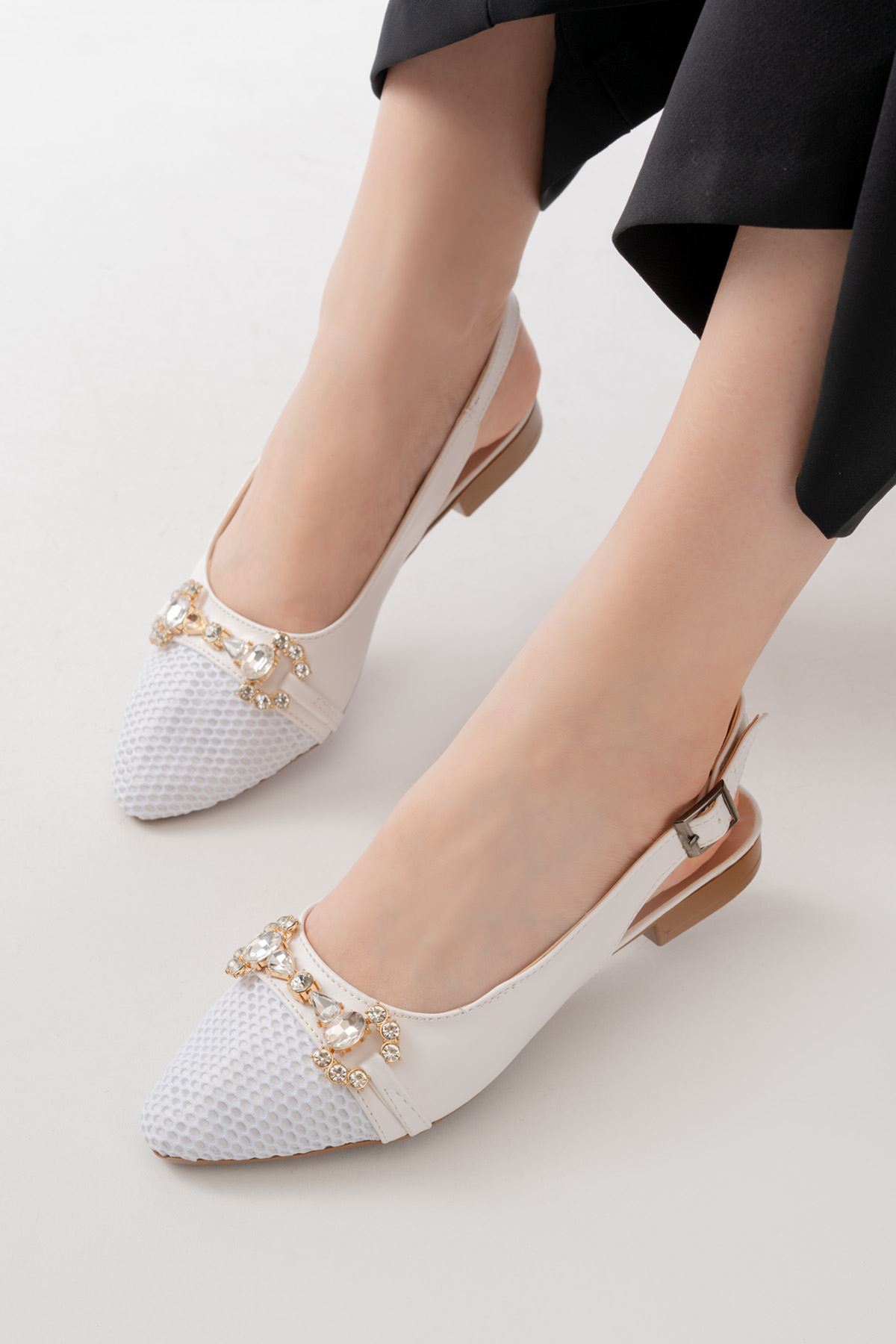 İNF-120 Beyaz Günlük Fileli Taş Aksesuarlı Kadın Babet