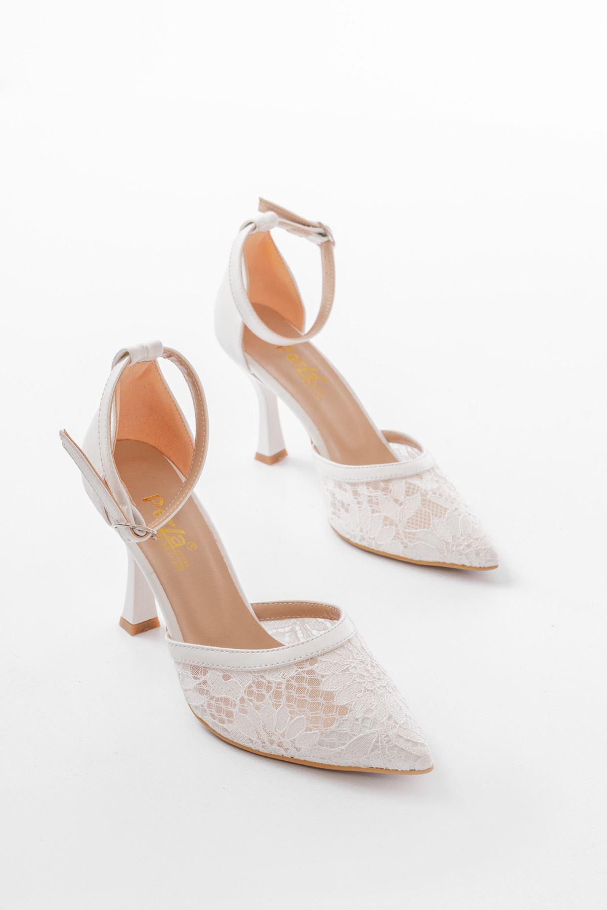 K-404 Beyaz Fileli Çiçek Detaylı Kadın Topuklu Ayakkabı