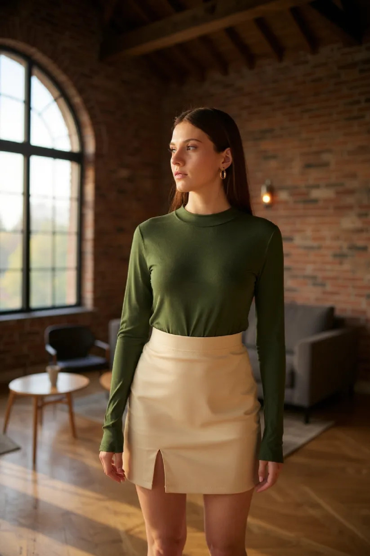 • Parmak detaylı uzun kollu body, haki yeşil rengin doğal ve modern havasıyla birleşerek casual ve şık kombinlere uyum sağlar.
