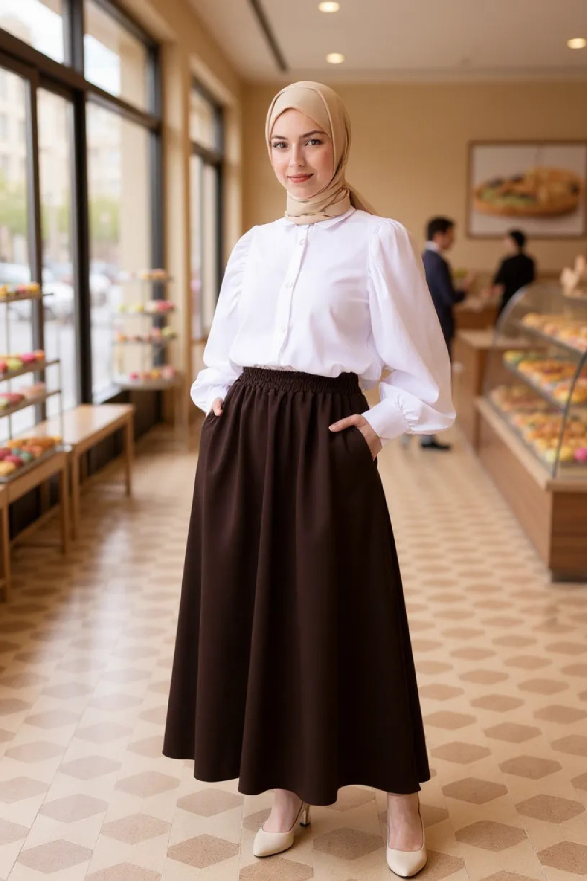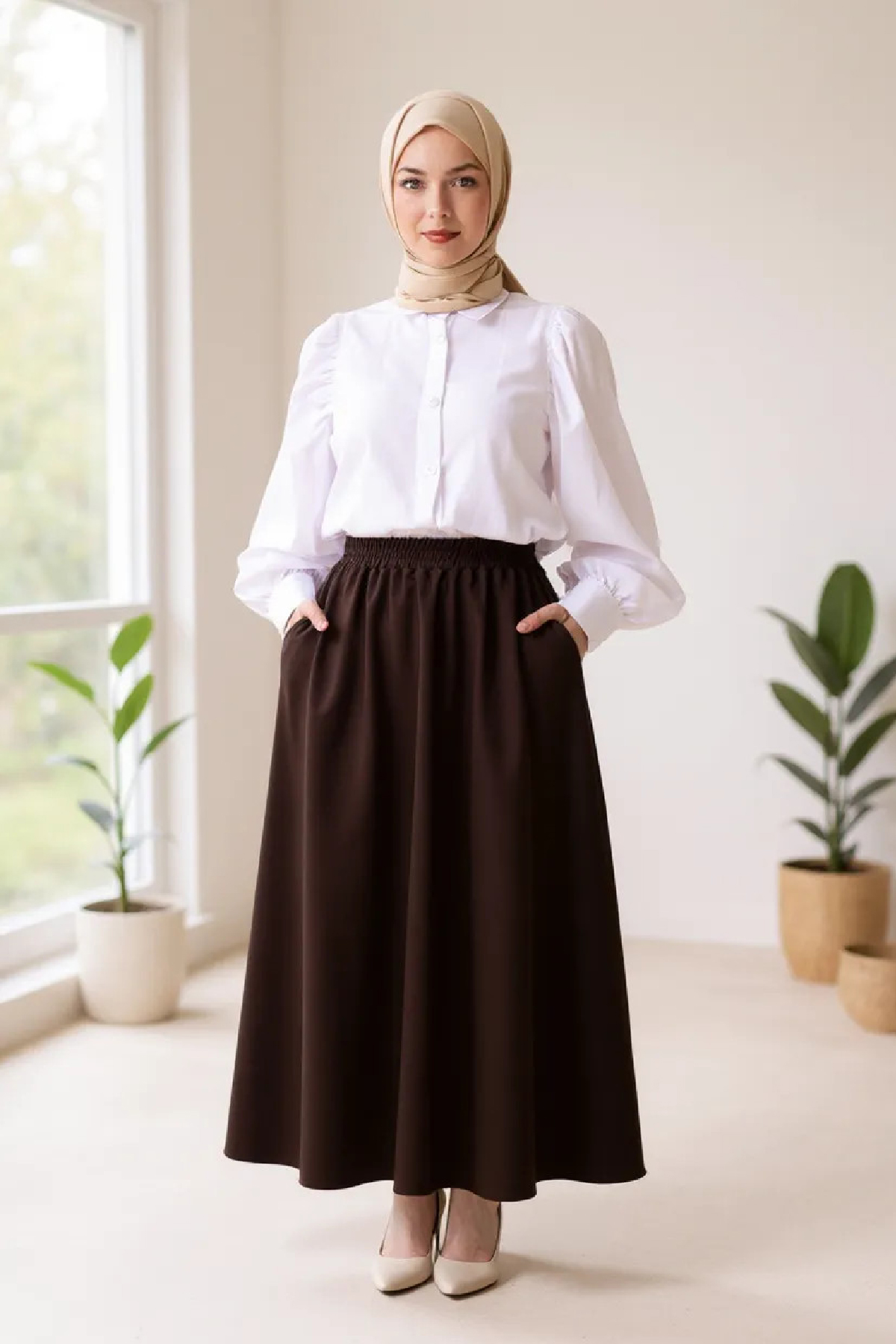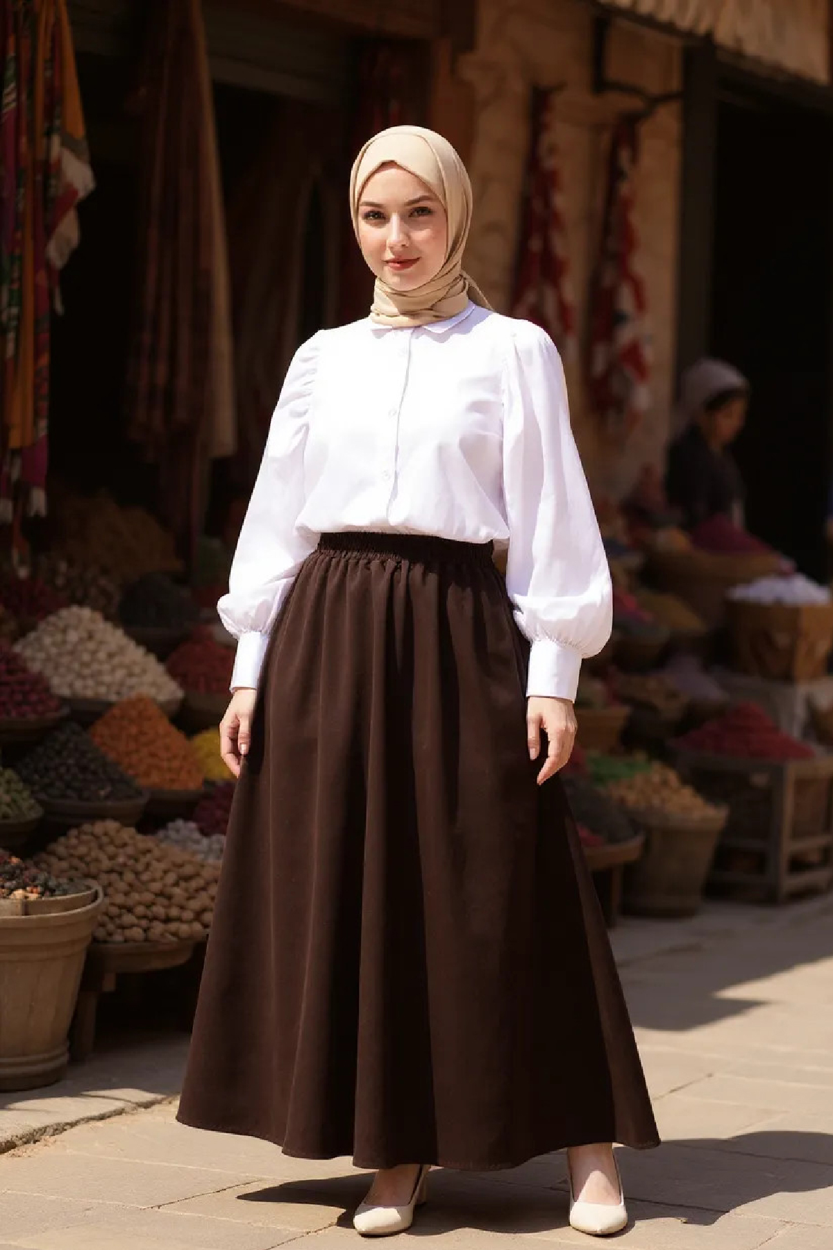 • Doğal & Sade Kombin: Kahverengi eteği bej oversize gömlek, krem şal ve düz babetlerle kombinleyerek zarif ve doğal bir görünüm elde edebilirsiniz.