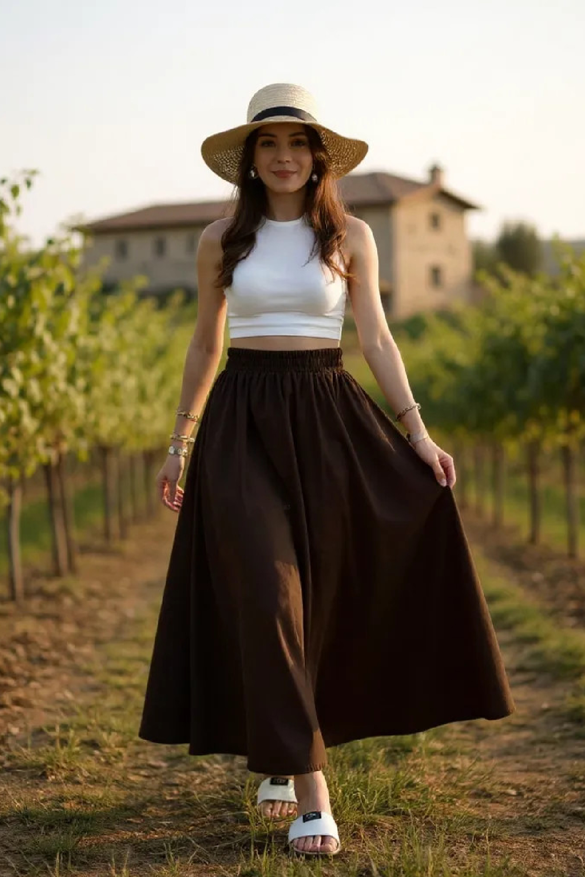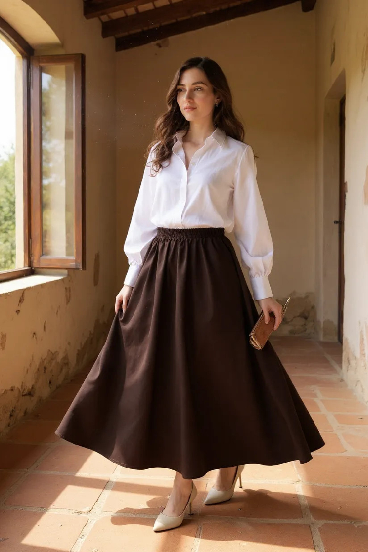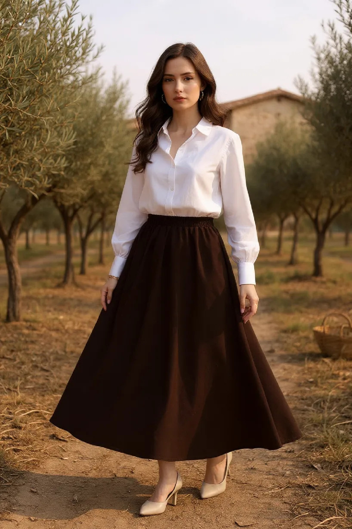 • Özel Gün Kombini: Ipek gömlek, inci detaylı şal ve topuklu ayakkabılarla kahverengi eteği davetlerde zarif bir şekilde kullanabilirsiniz.