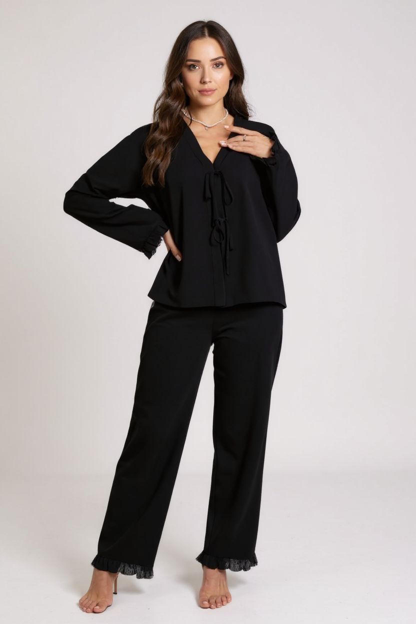 - Ev giyiminde hem şıklığı hem de rahatlığı bir arada arayan kadınlar için tasarlanan Kadın Siyah Önden Bağlamalı Kolu ve Paçası Fırfır Detaylı Uzun Kollu Pijama Takımı, asil duruşu ve modern tasarımıyla ön plana çıkıyor.
