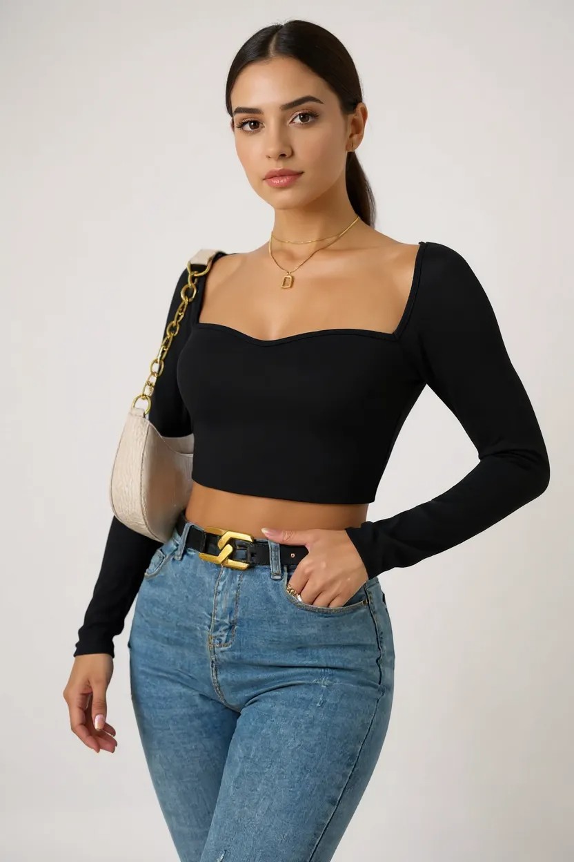 Kadın Siyah Uzun Kol Göğüs Dekolteli Şık Crop Top Bluz – Şık, Rahat ve Kolay Kombinlenebilir