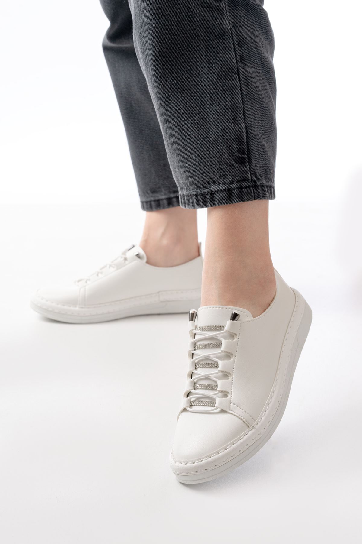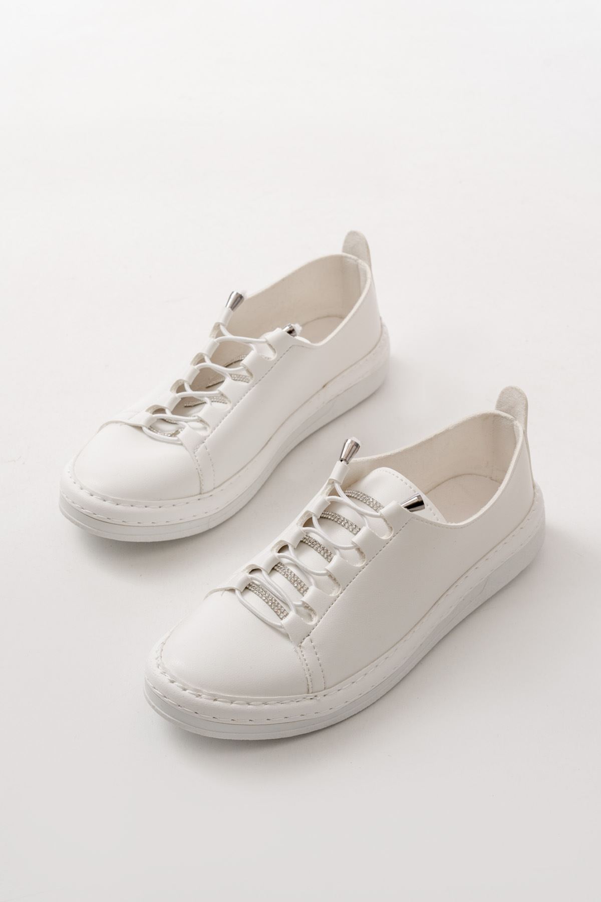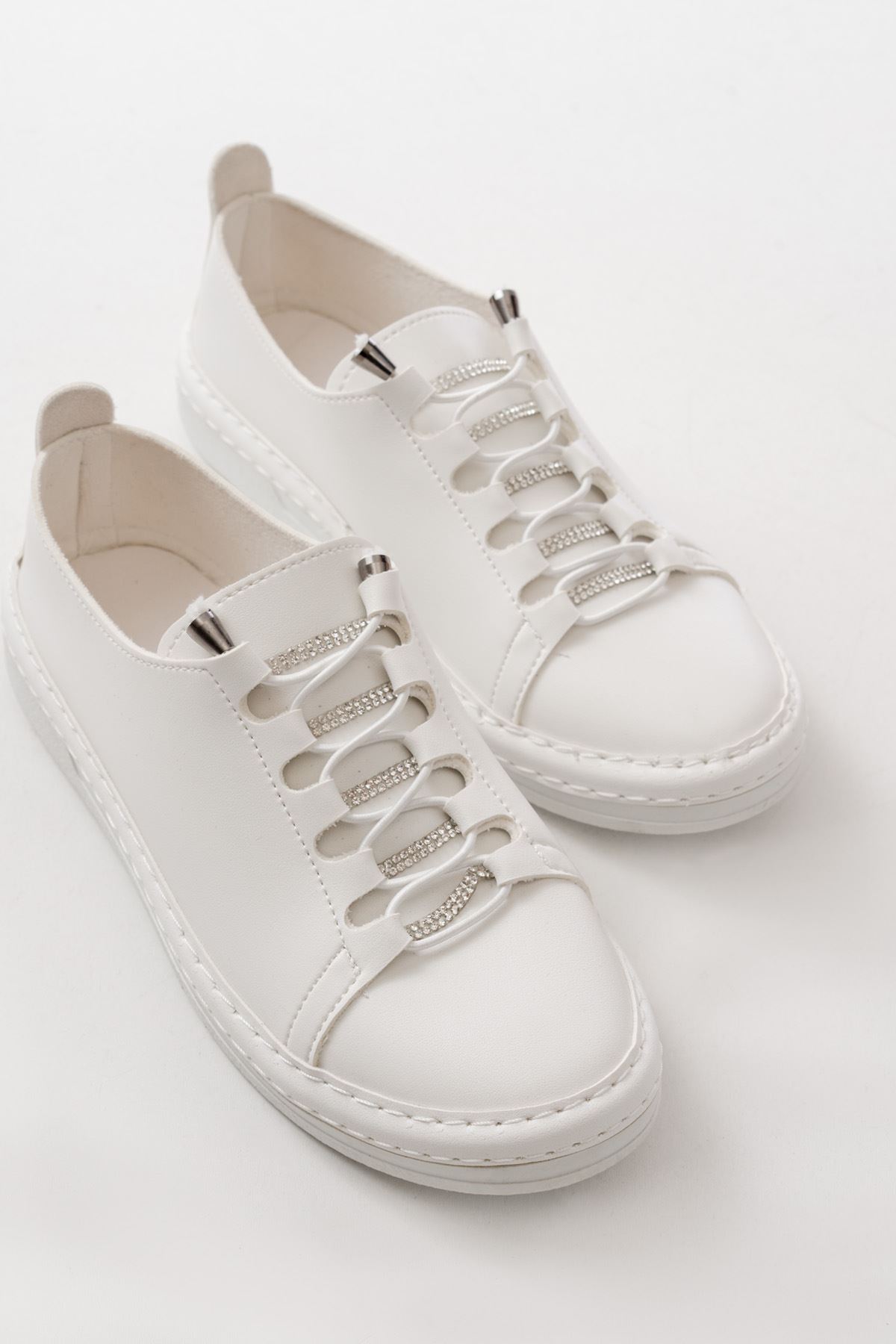 MK-9026 Beyaz Bağcıklı Taş Aksesuarlı Günlük Spor Ayakkabı