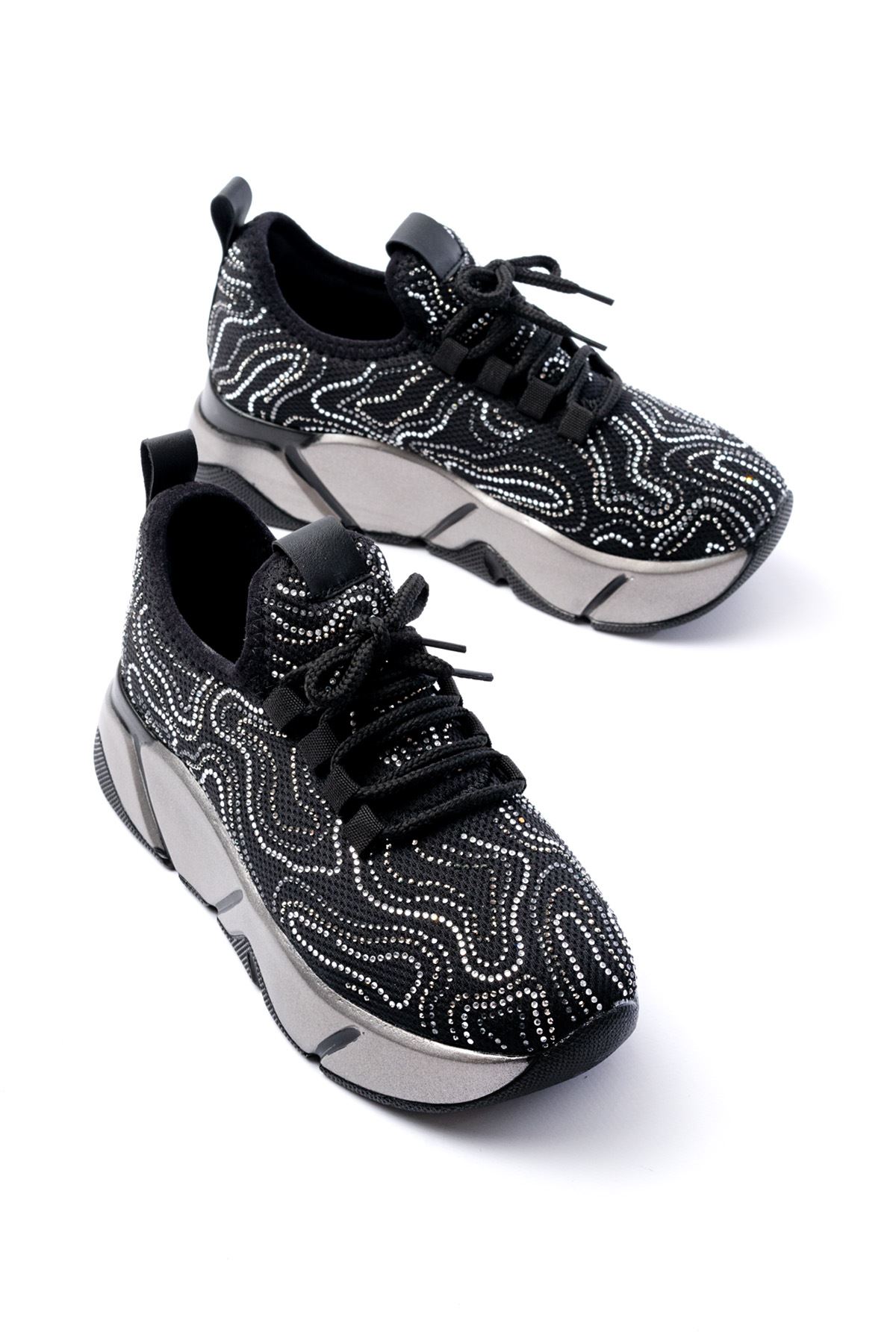 RS-402 Siyah Bağcıklı Fileli Taşlı Platin Taban Günlük Kadın Spor