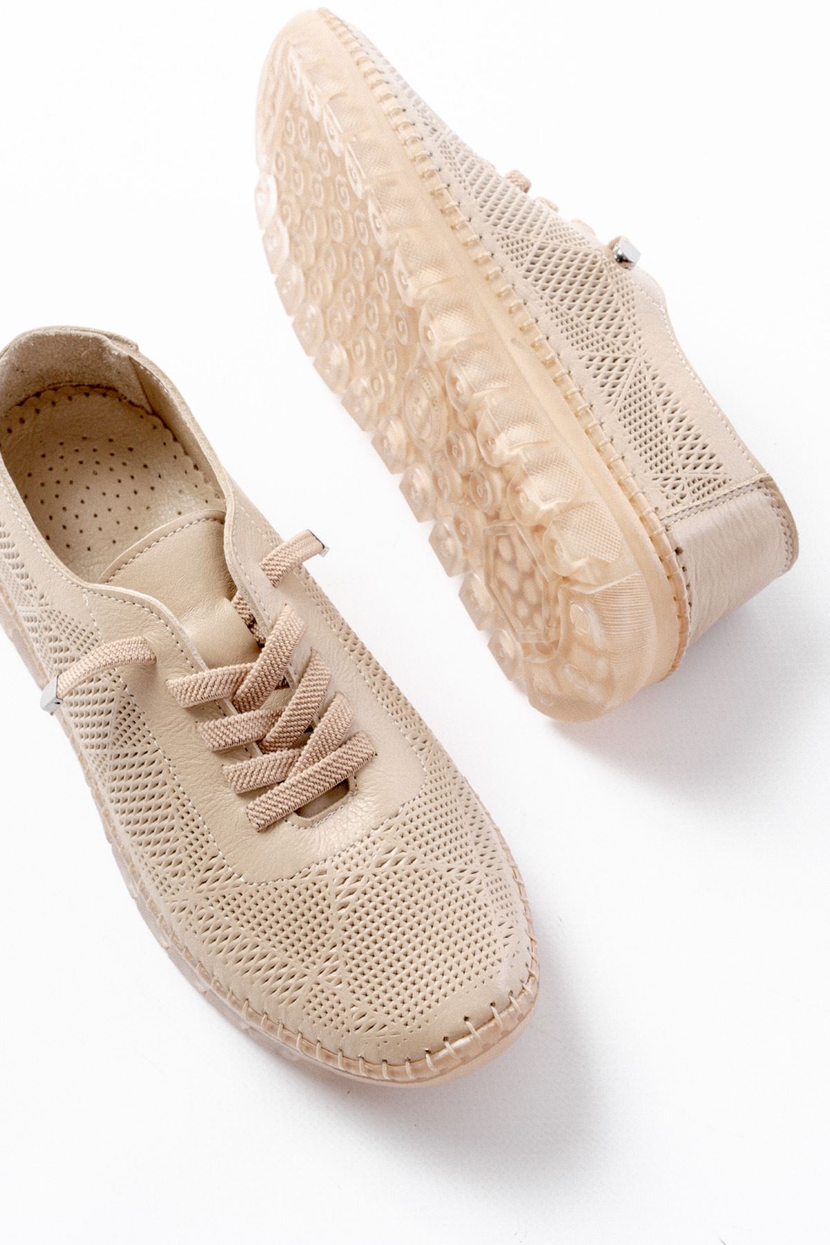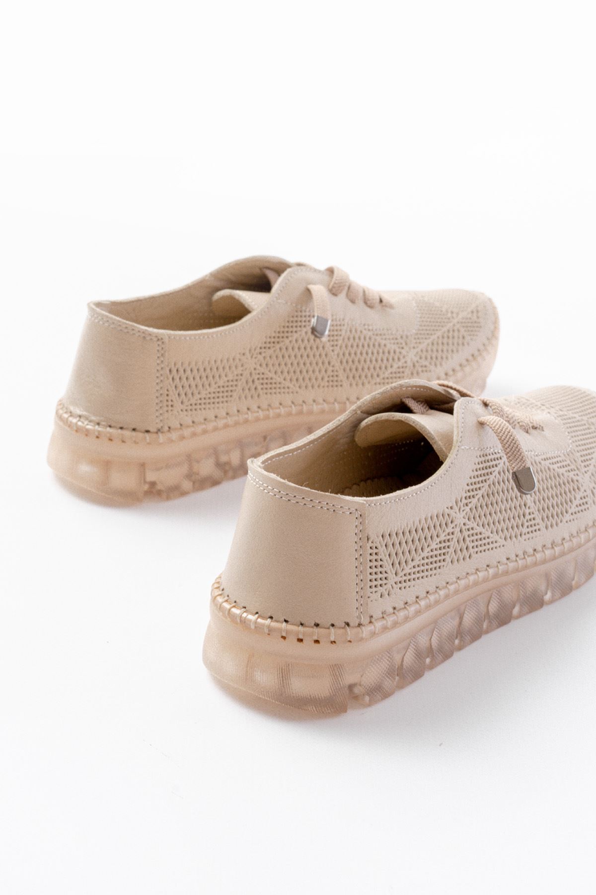 S-365 Bej Desenli Hakiki Deri Şeffaf Taban Kadın Spor Ayakkabı