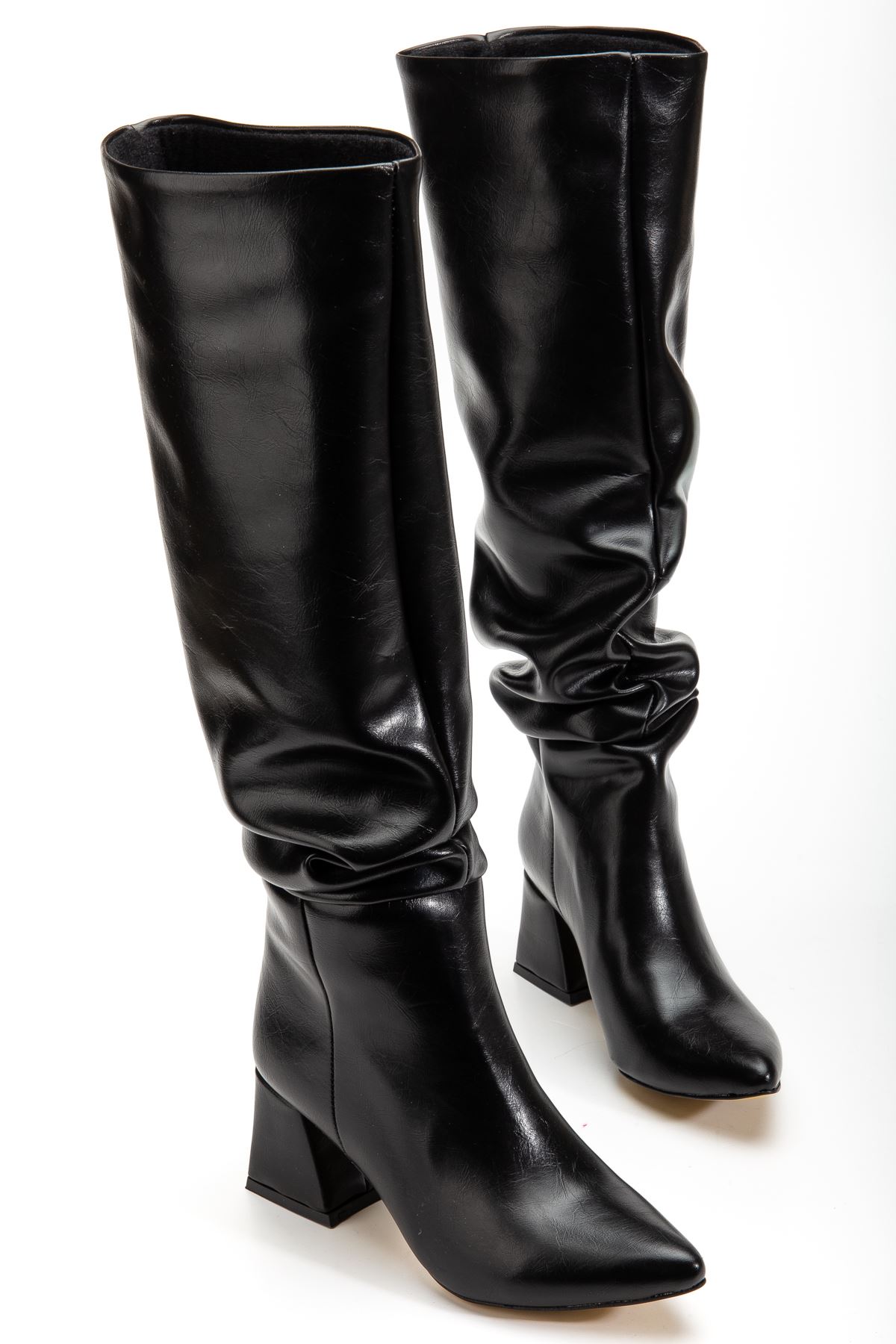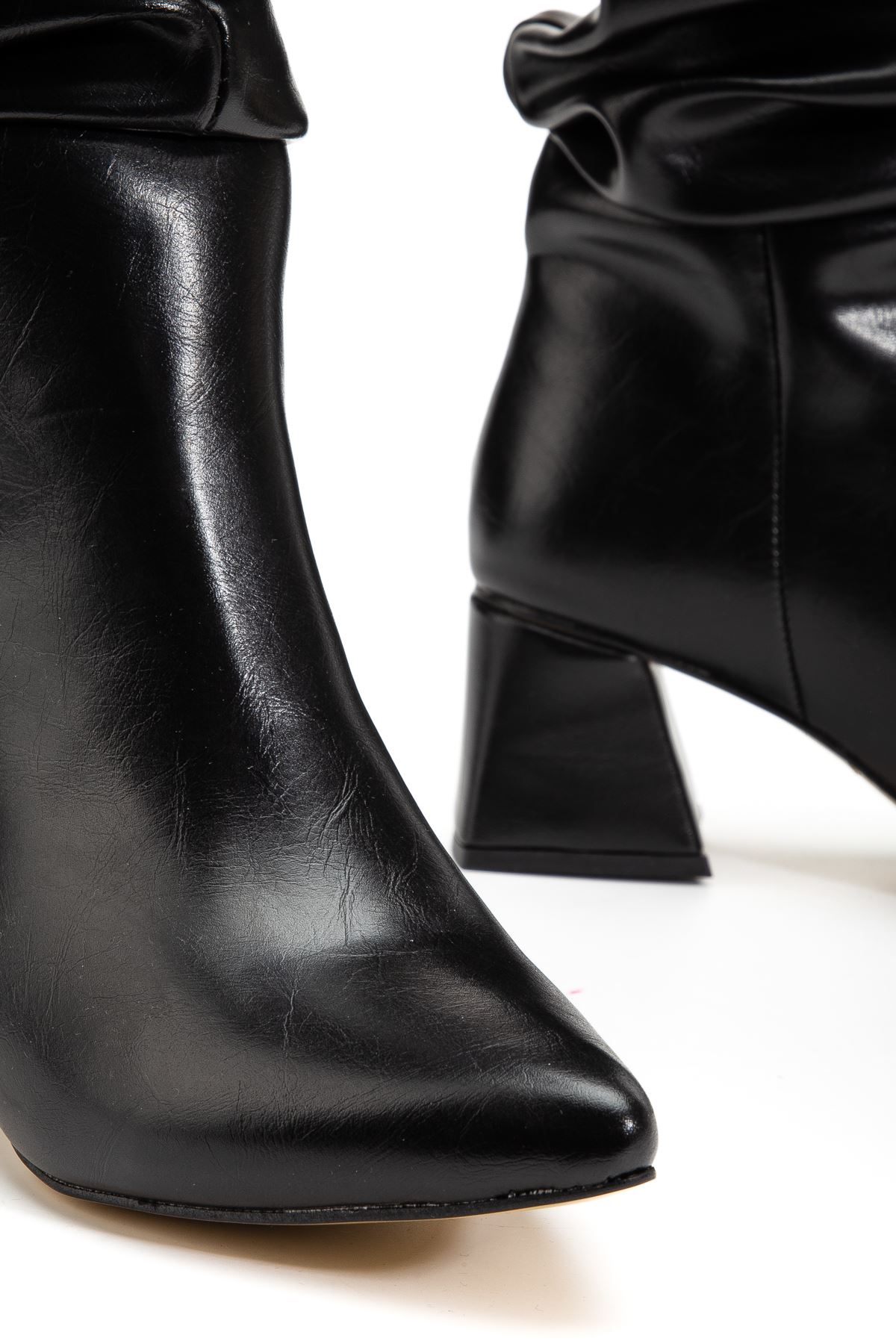 SYT-2002 Siyah Kırışık Rugan Körüklü Kalın Topuklu Günlük Bayan Çizme