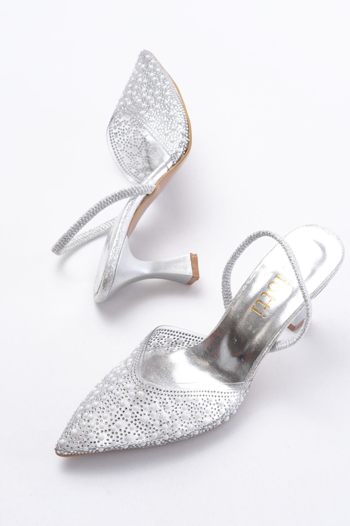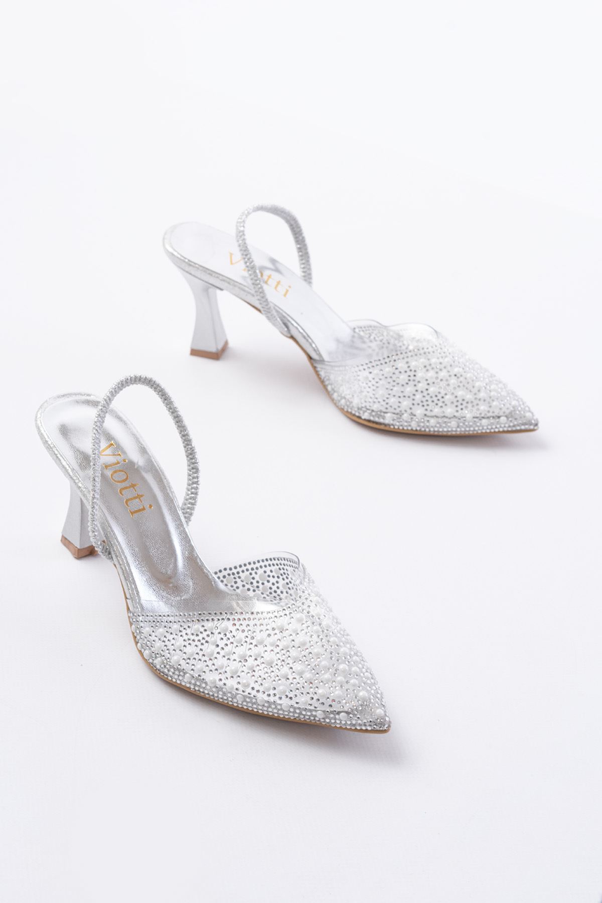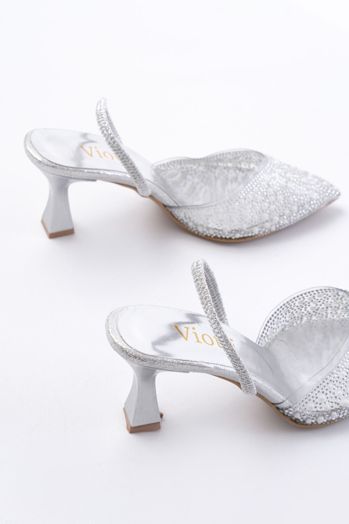 V-1005 Gümüş Günlük Arkası Açık Taşlı Topuklu Bayan Ayakkabı